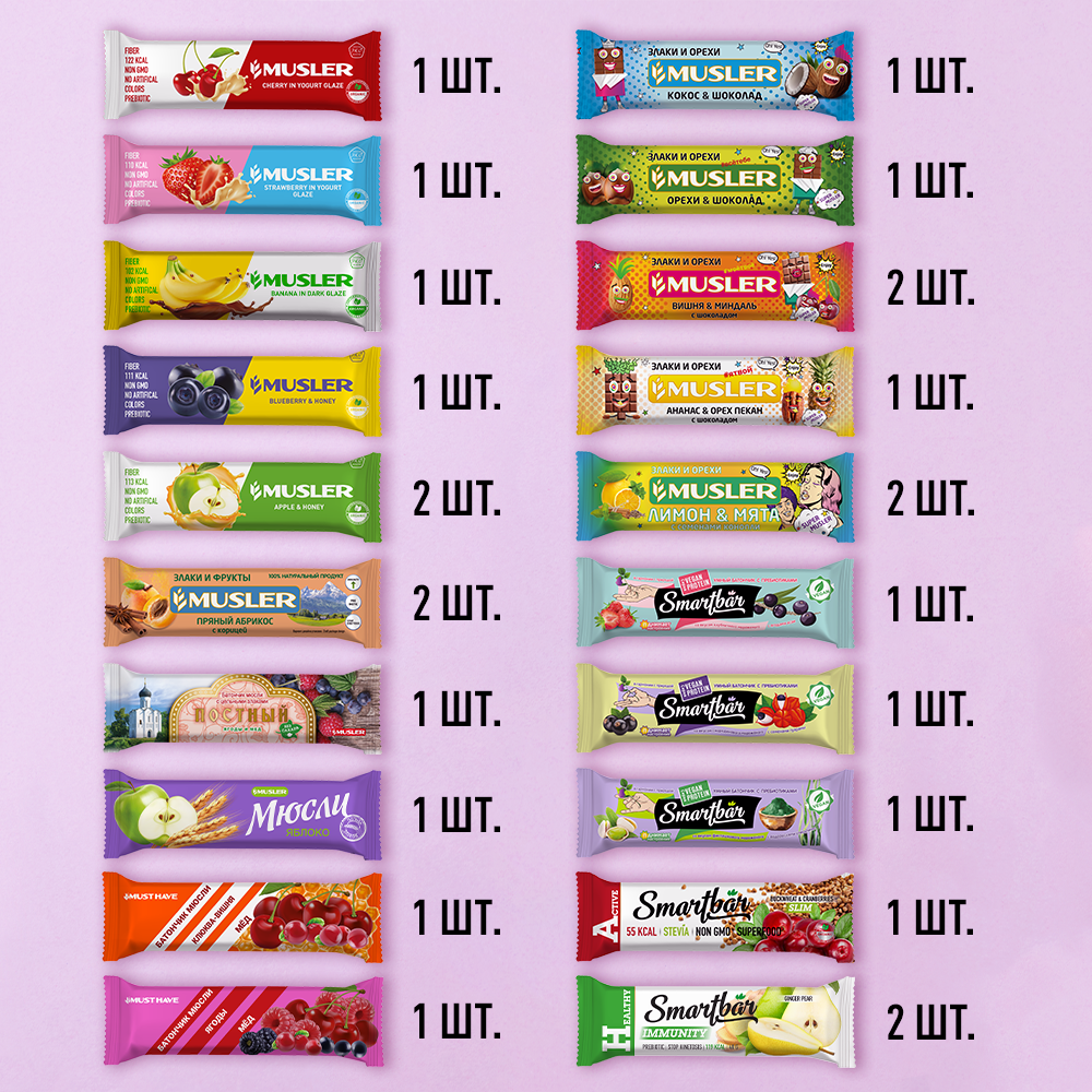 Батончики мюсли MUSLER & Smartbar Ассорти "Мегамикс - все вкусы" 25 шт. информация: