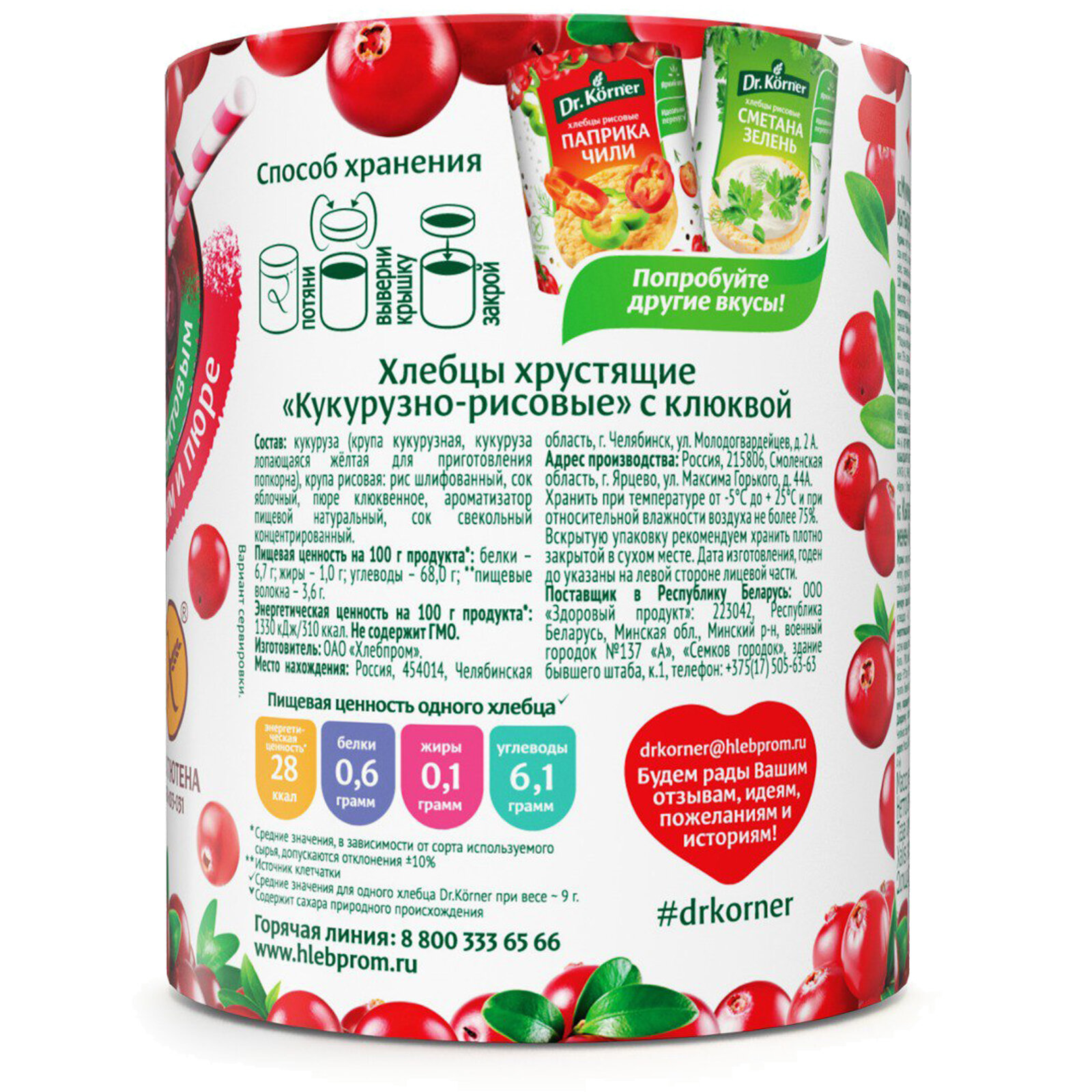 Отзывы на Хлебцы Dr.Korner кукурузно-рисовые с Клюквой, 3 упаковки по 90г.