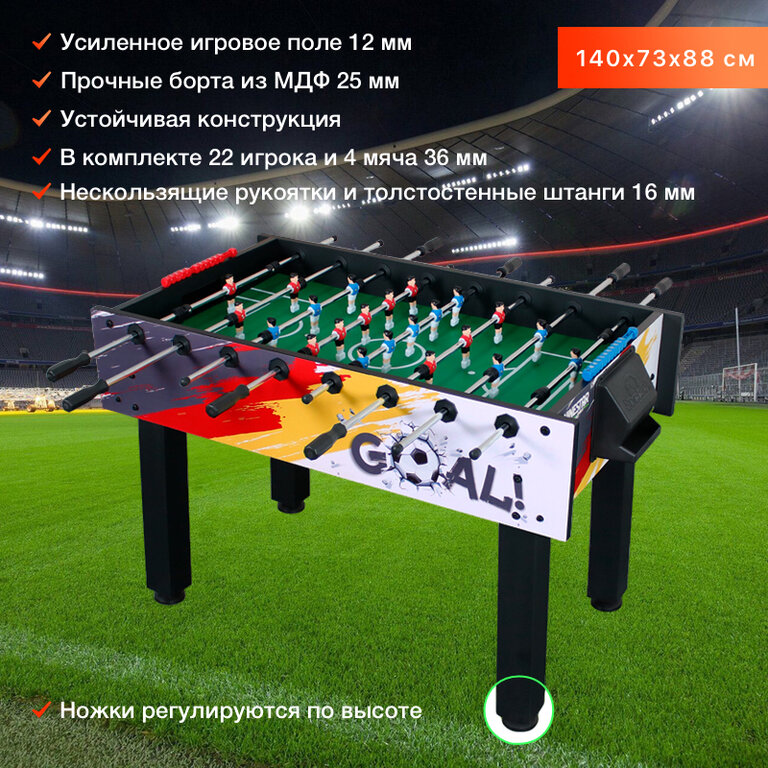 | Дополнительная информация | игровое поле из МДФ 12 мм, усилено металлическими стержнями, ноги полые из МДФ 90x90x15 мм, износостойкие ударопрочные втулки AH-09 |