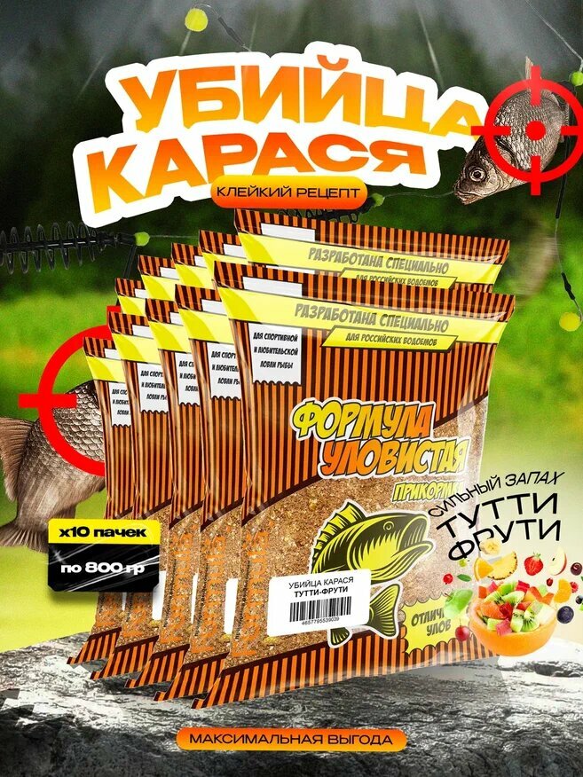 10 цен на Прикормка "уловистая" 0,8кг убийца карася - клейкий рецепт (тутти-фрути) набор 10 штук по 0,8 кг