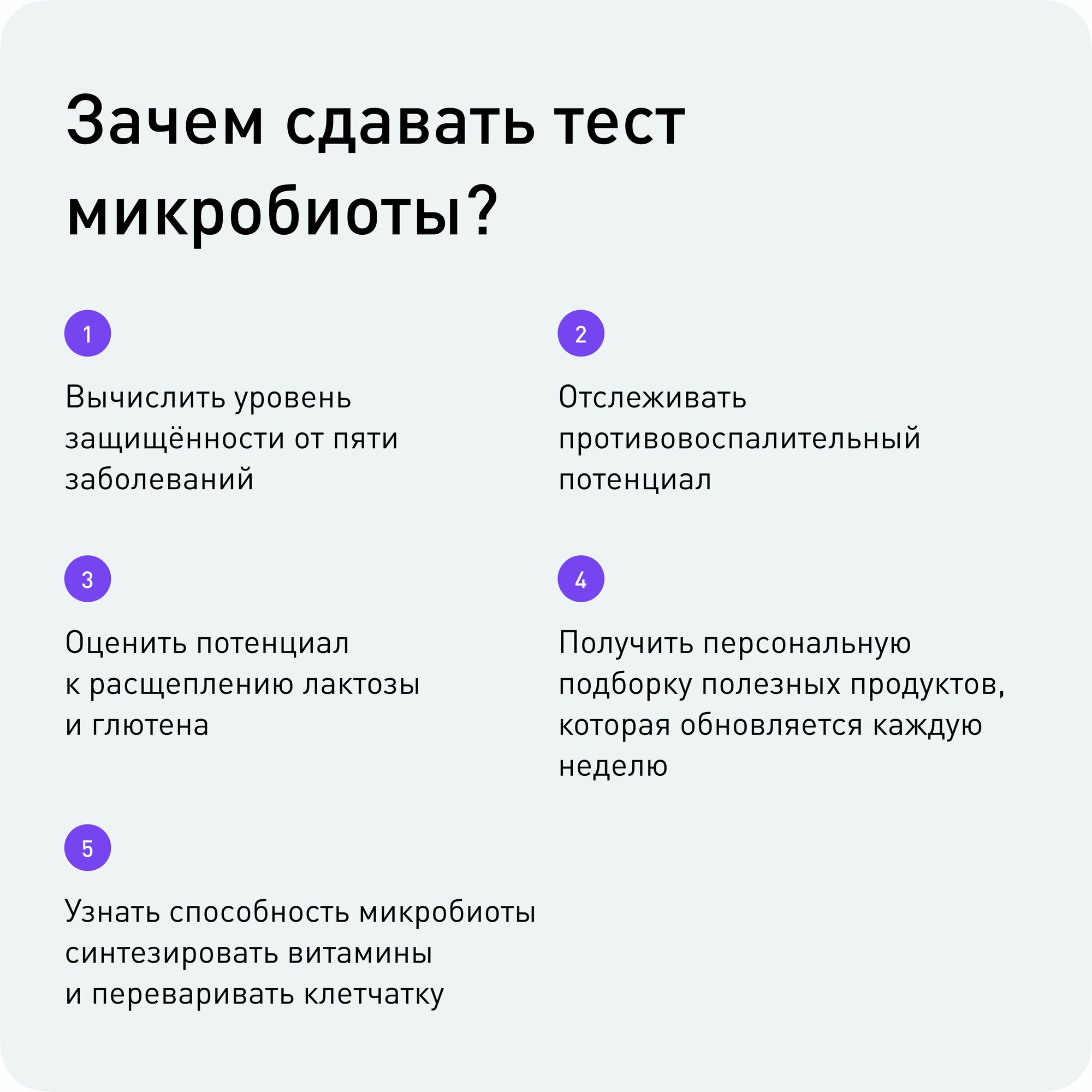 | Назначение | генетическое исследование / для определения состояния здоровья / исследование генетики микробиома / исследование генетики микробиоты / определение генетических особенностей в сфере питания |