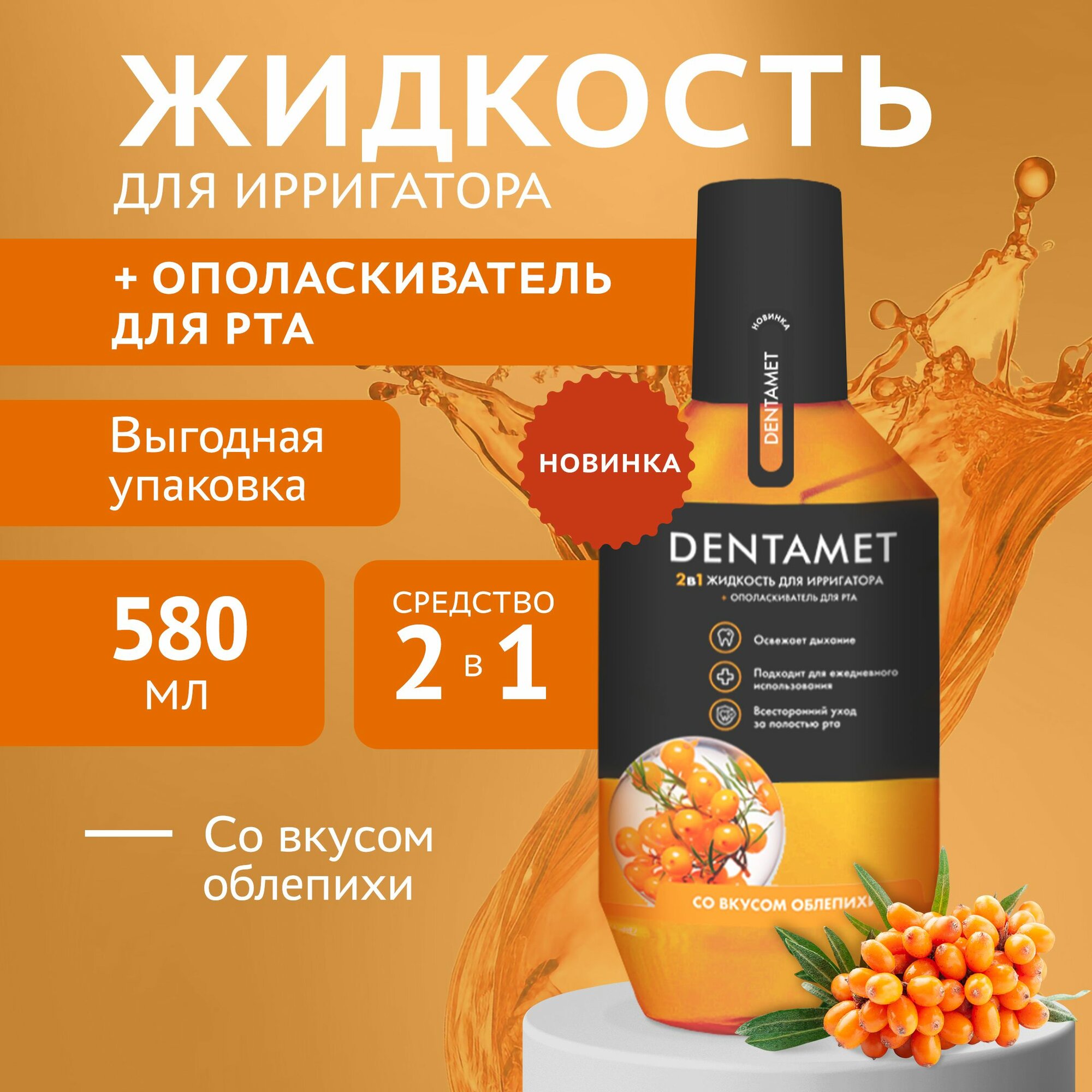 Средство 2в1 для гигиены полости рта со вкусом облепихи DENTAMET: Жидкость для ирригатора и Ополаскиватель 580 мл