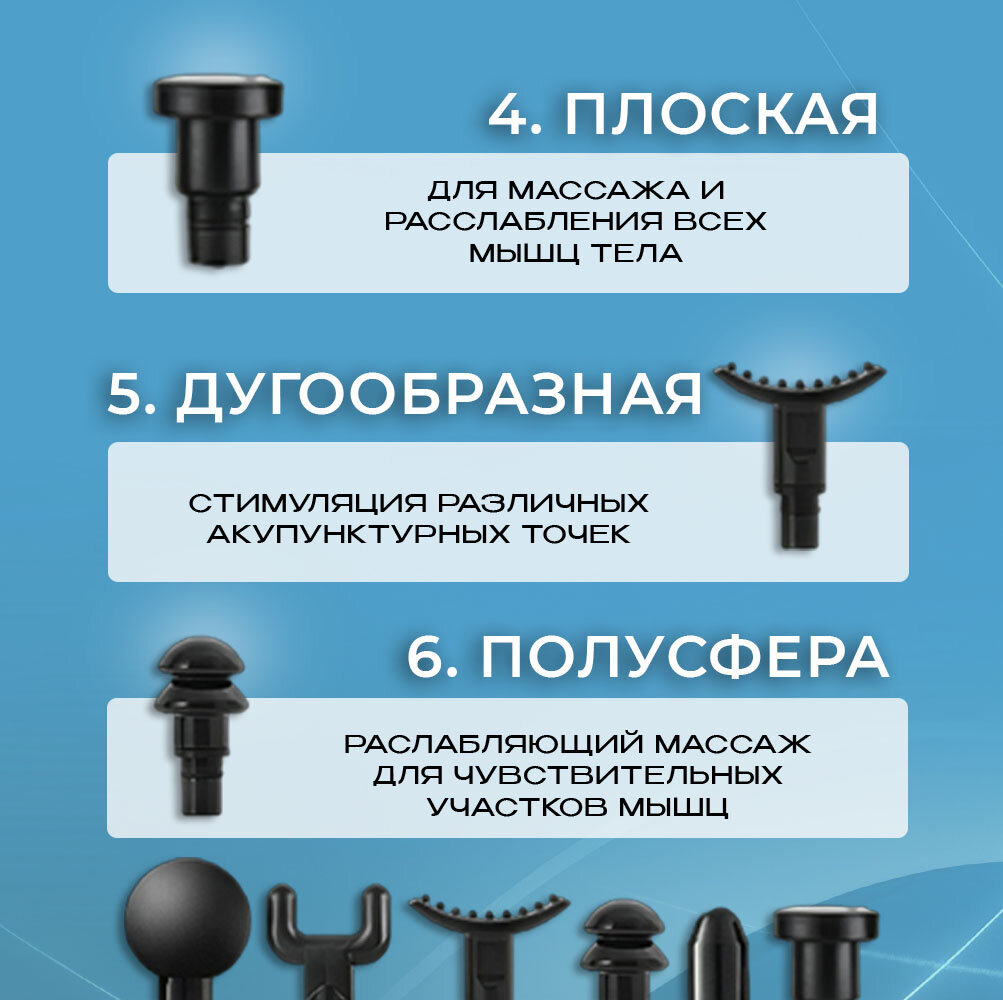 | Подробная комплектация | Перкуссионный массажер - 1шт Зарядный кабель - 1шт Насадки - 6шт Защитный кейс - 1шт инструкция - 1шт |