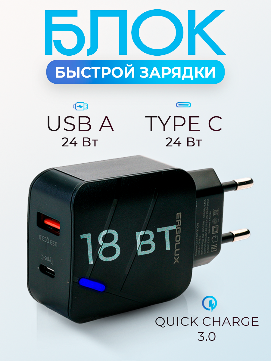 Блок питания, сетевое зарядное устройство 18W ERGOLUX USB 3 QC + Type C информация: