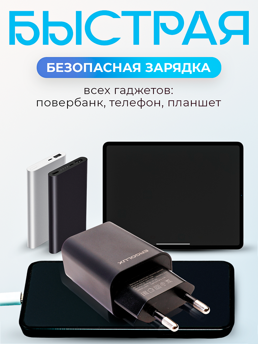 Отзывы на Блок питания, сетевое зарядное устройство 18W ERGOLUX USB 3 QC + Type C