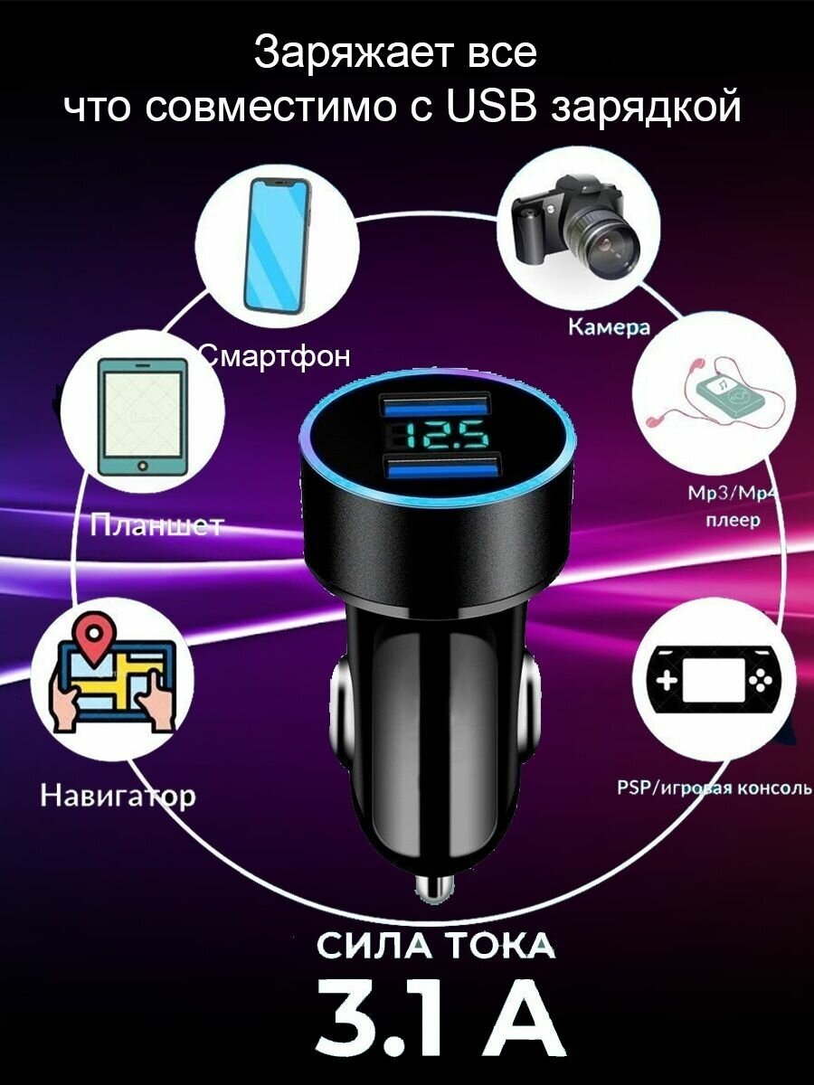 Автомобильное зарядное устройство 2 USB с вольтметром в прикуриватель в машину информация: