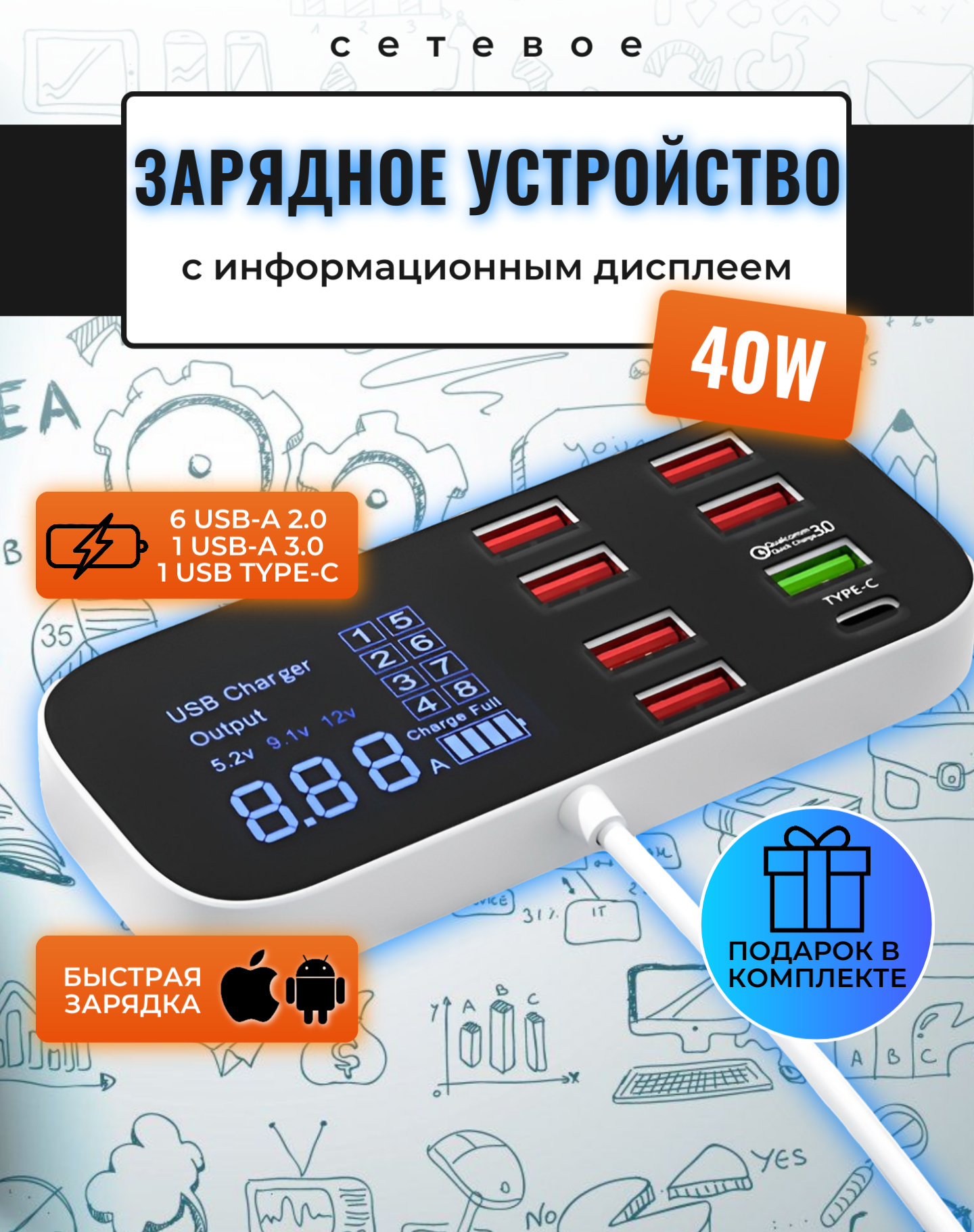 Зарядное устройство 40 Ватт с 8-ю портами и креплением на стену информация: