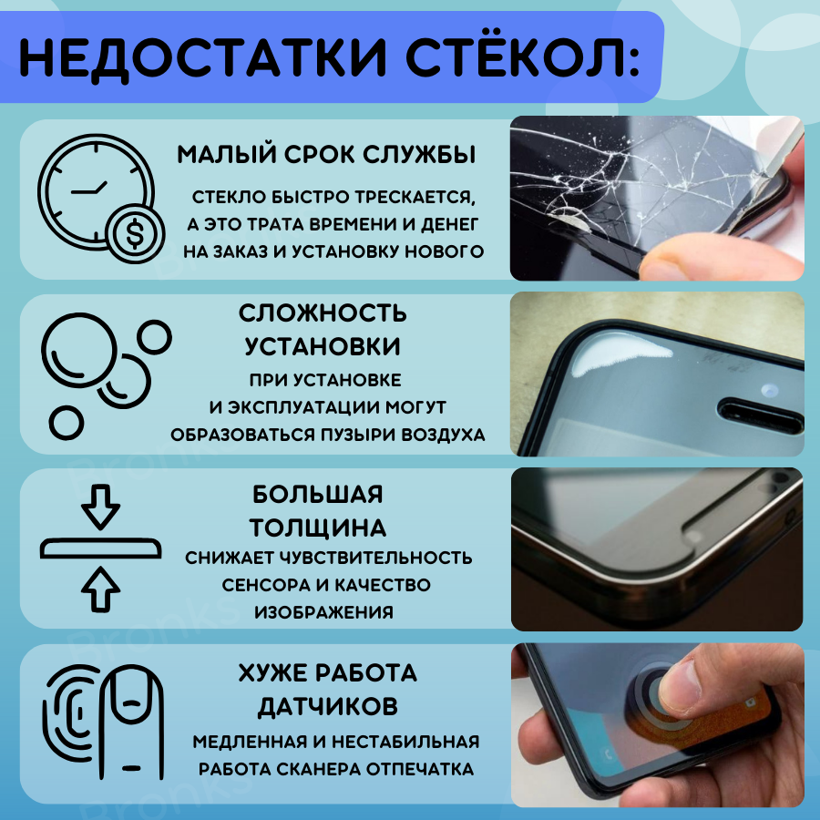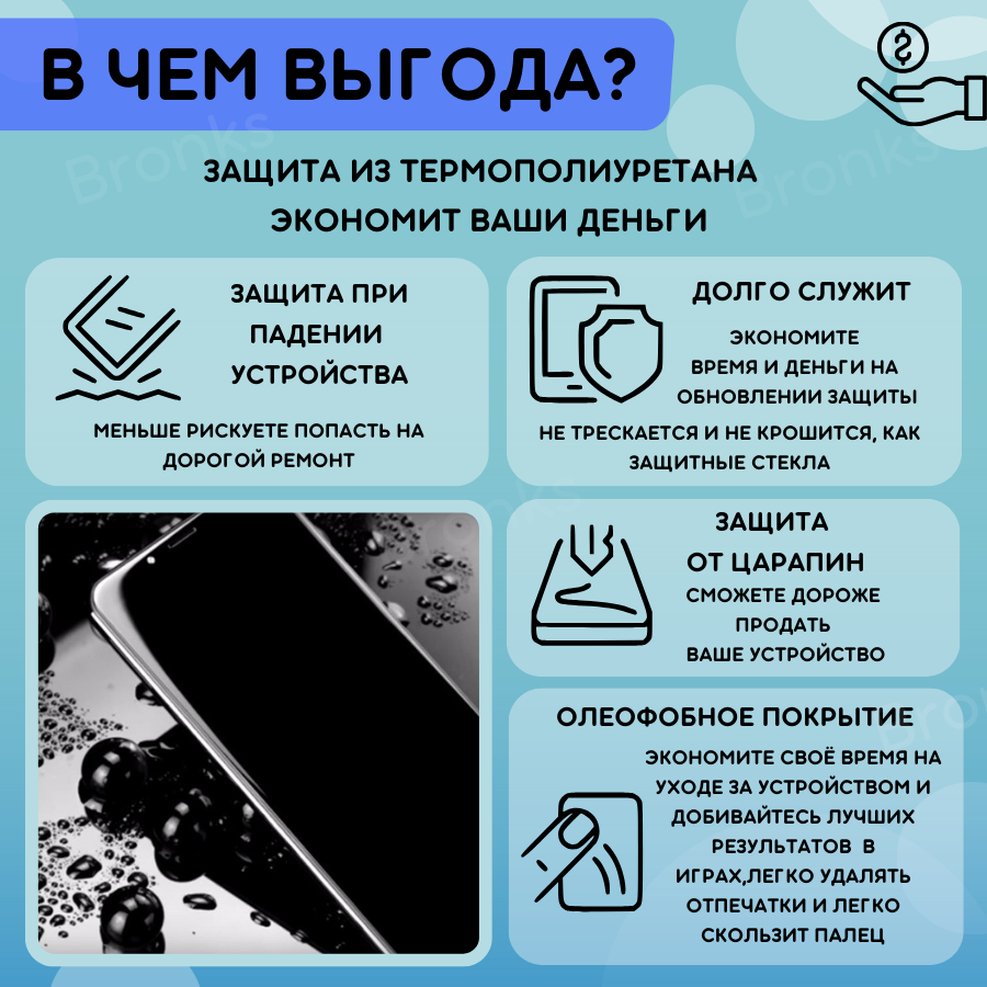 | Особенности | глянцевая поверхность / матовая поверхность / олеофобное покрытие / под чехол / прозрачность / самовосстанавливающаяся |