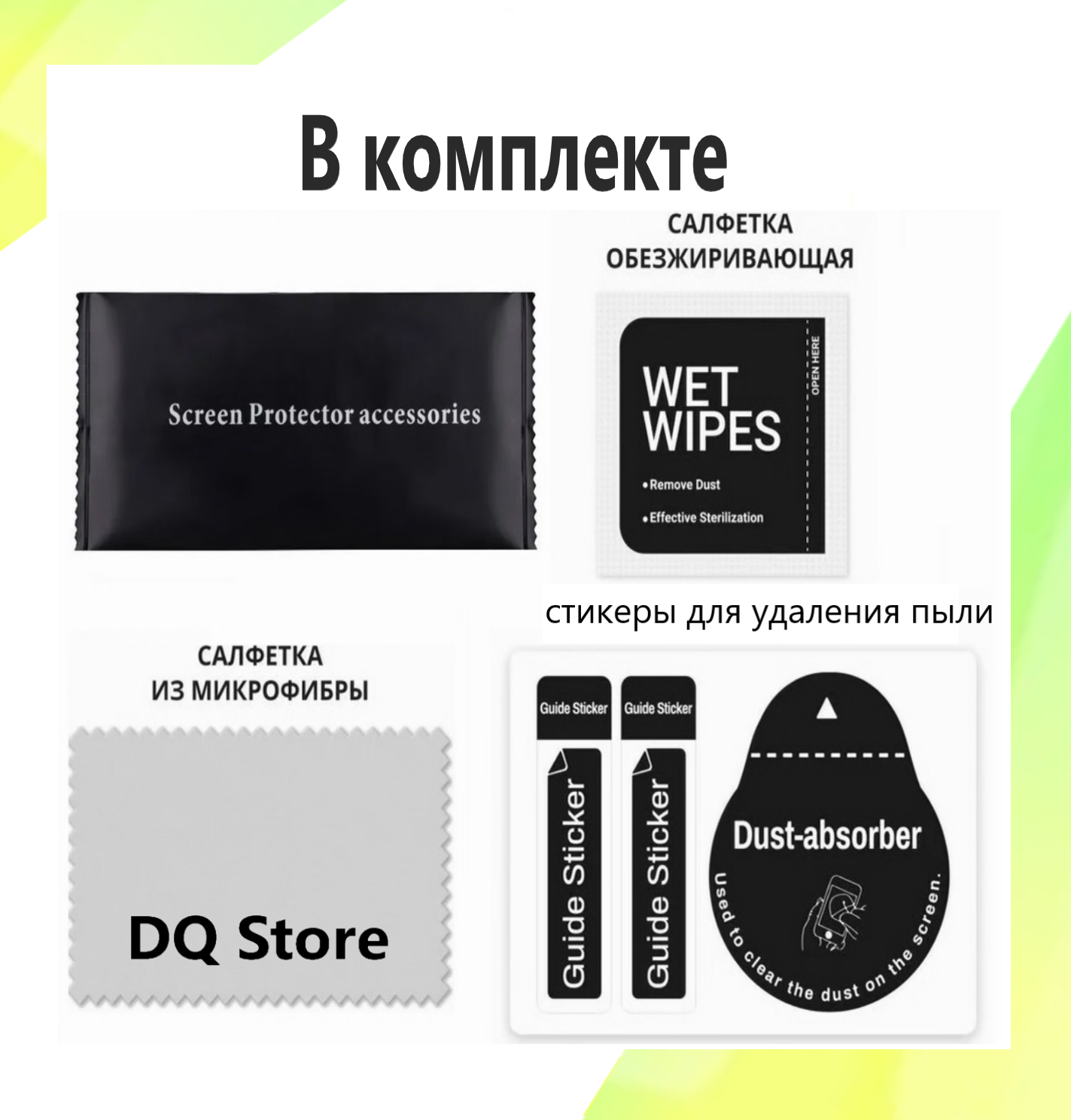 | Подробная комплектация | Стекло 1 шт ; стикеры для удаления пыли - 1 шт ; влажная салфетка - 1 шт ; сухая салфетка - 1 шт. |