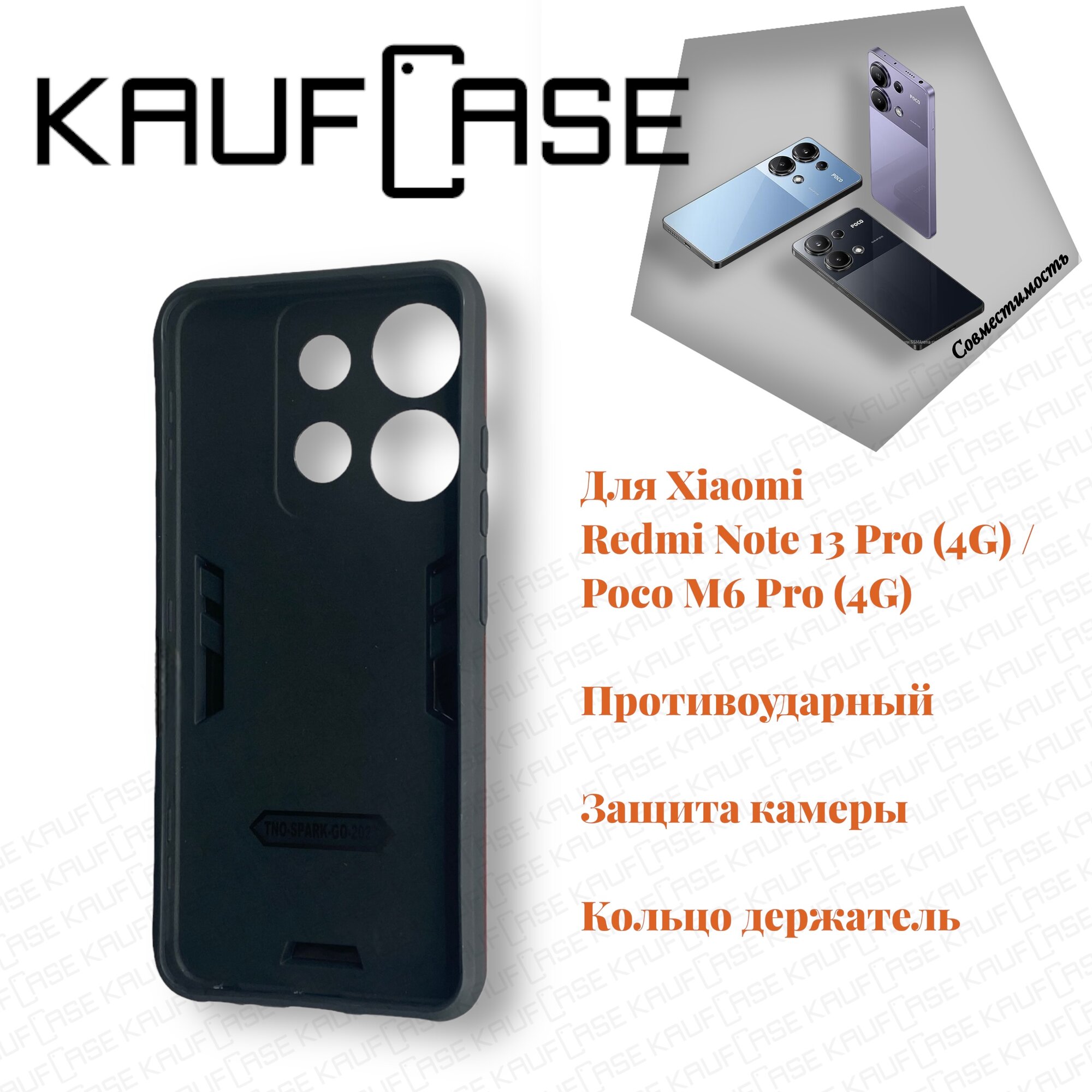 Противоударный чехол на Xiaomi Redmi Note 13 Pro 4G/ Poco M6 Pro (6.67"), черный. Кольцо-держатель и магнитное крепление, яркие пластиковые защитные вставки информация: