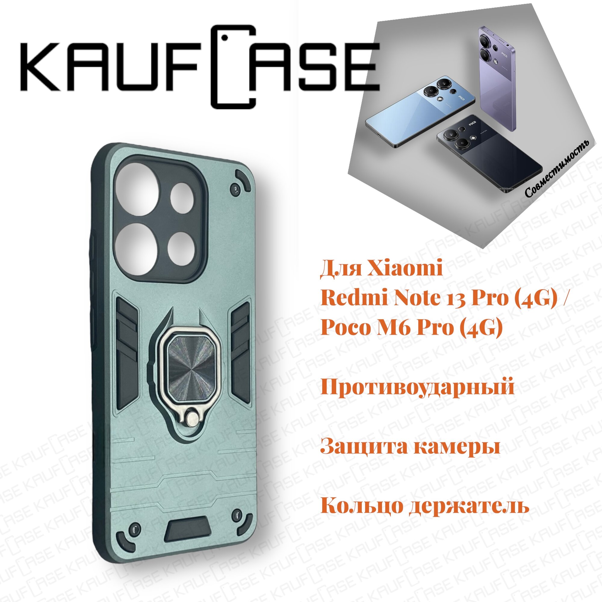Отзывы на Противоударный чехол на Xiaomi Redmi Note 13 Pro 4G/ Poco M6 Pro (6.67"), темно-зеленый. Кольцо-держатель и магнитное крепление, яркие пластиковые защитные вставки