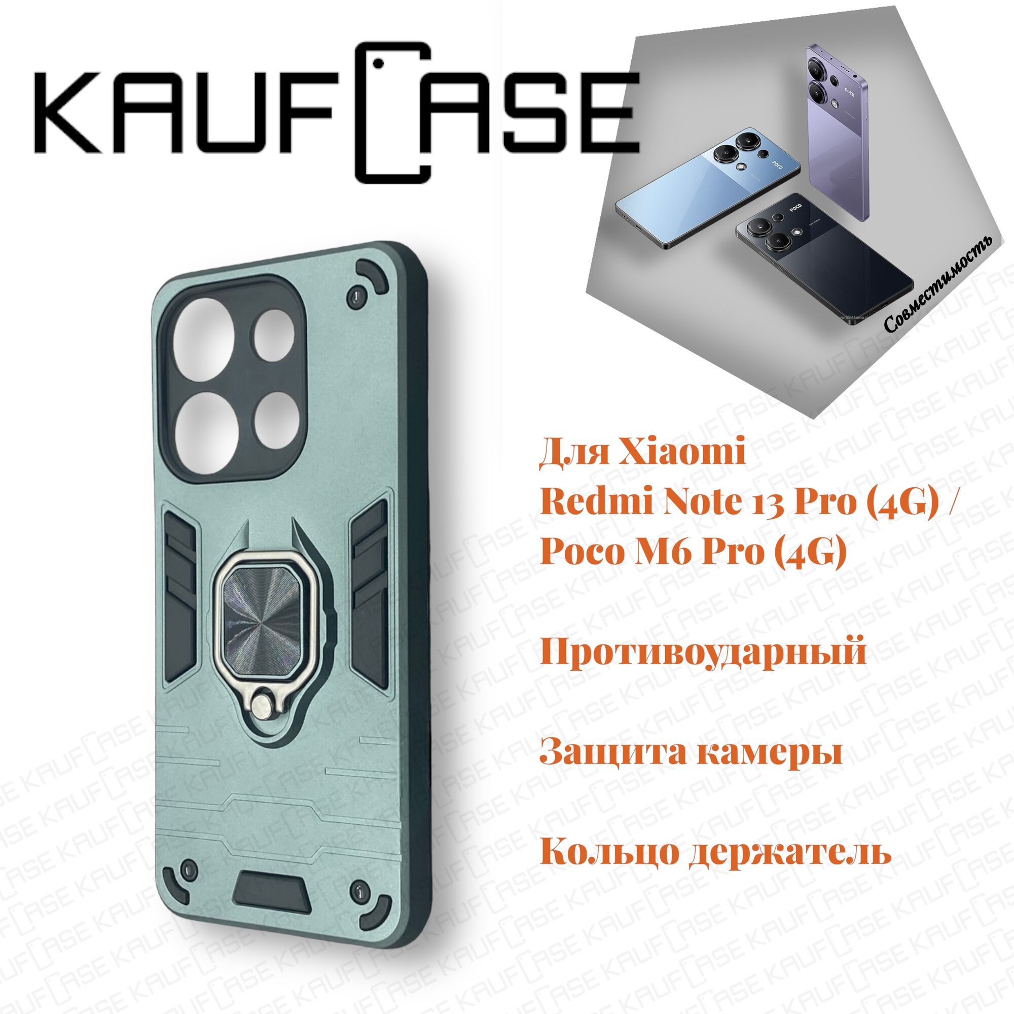 Противоударный чехол на Xiaomi Redmi Note 13 Pro 4G/ Poco M6 Pro (6.67"), темно-зеленый. Кольцо-держатель и магнитное крепление, яркие пластиковые защитные вставки информация: