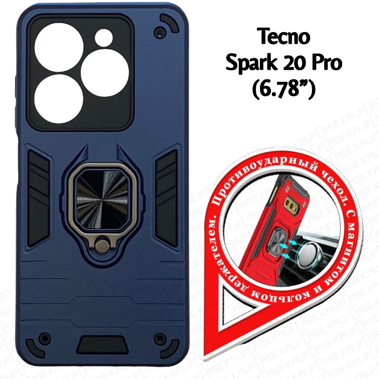 Противоударный чехол на Tecno Spark 20 Pro (6.78"), темно-синий. Кольцо-держатель и магнитное крепление, яркие пластиковые защитные вставки информация:
