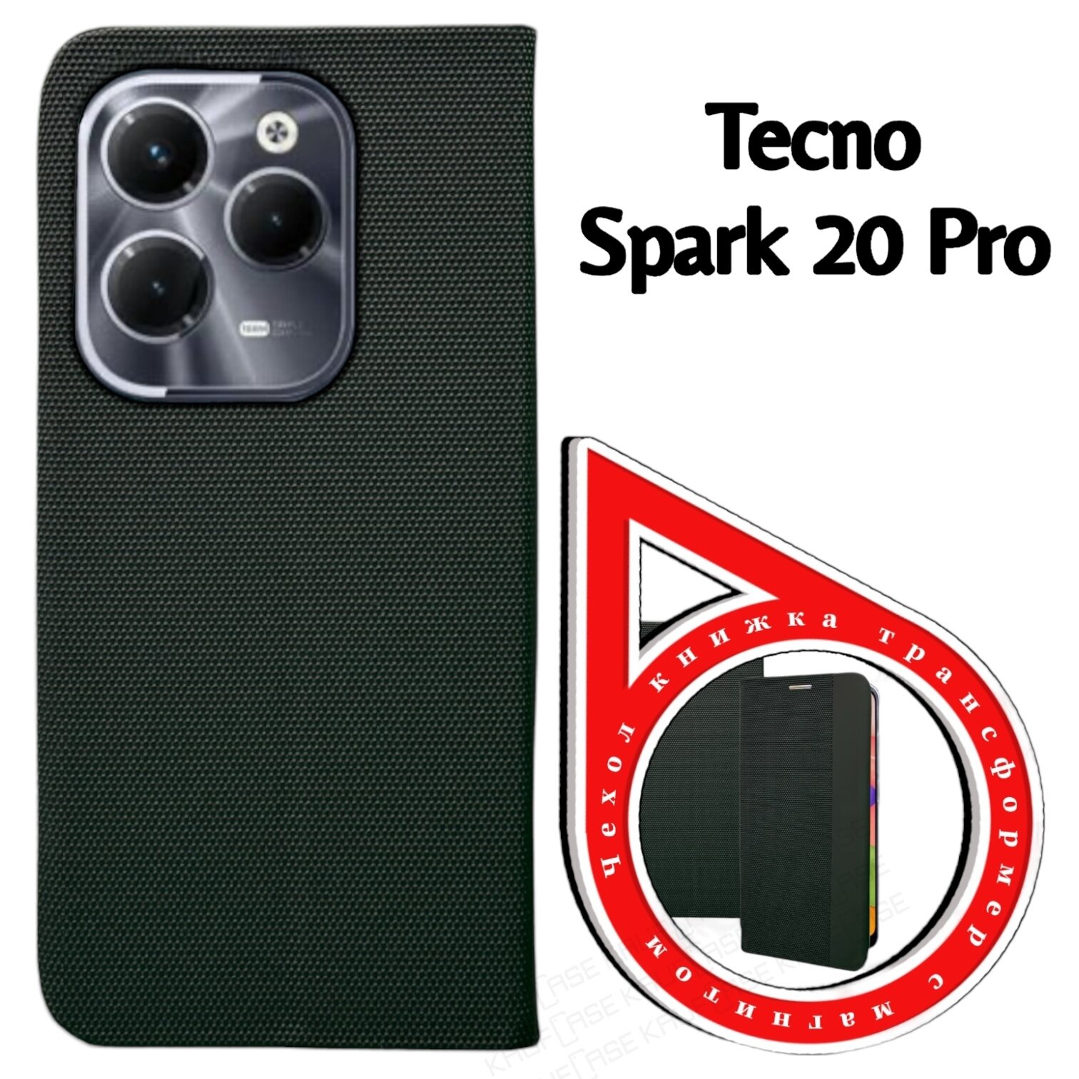 Тонкий и противоударный чехол-книжка Tecno Spark 20 Pro (6.78"), черный. Текстура под кожу; Вырез под динамик; Карман для карты 399 ₽