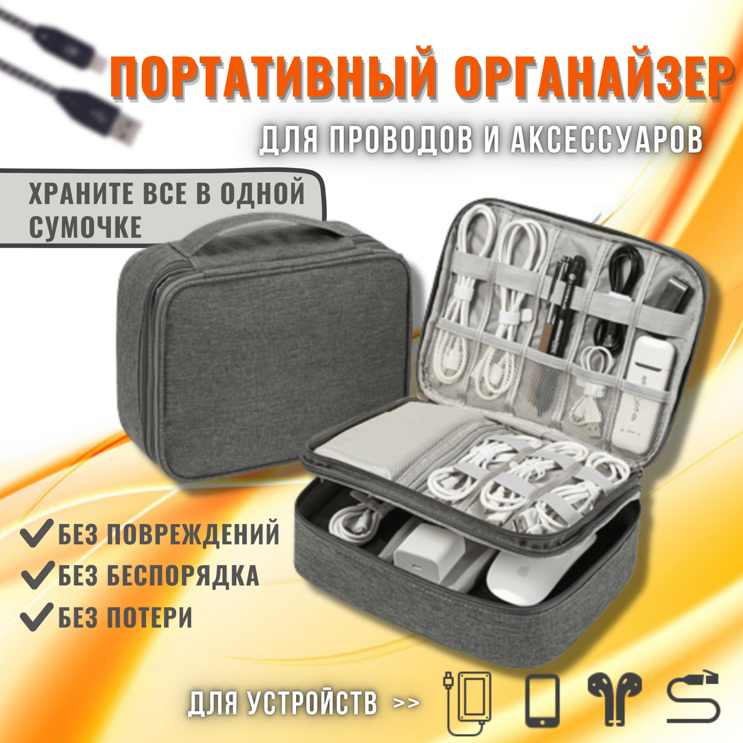 10 цен на Органайзер для хранения проводов, зарядок, кабелей, аксессуаров. Сумка для внешнего аккумулятора, цвет серый