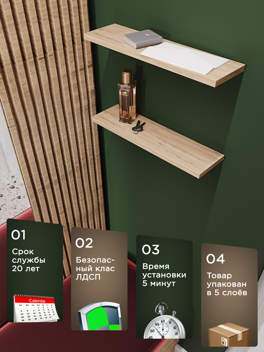 | Назначение | для гостиной/спальни / для детской / для икон / для книг / для кухни / для прихожей / для роутера / для специй / для фоторамок и сувенирной продукции / универсальное |