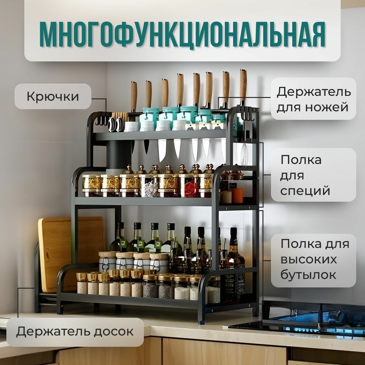 Полка для кухни, Стеллаж для специй, черный, 57х40х23 см информация: