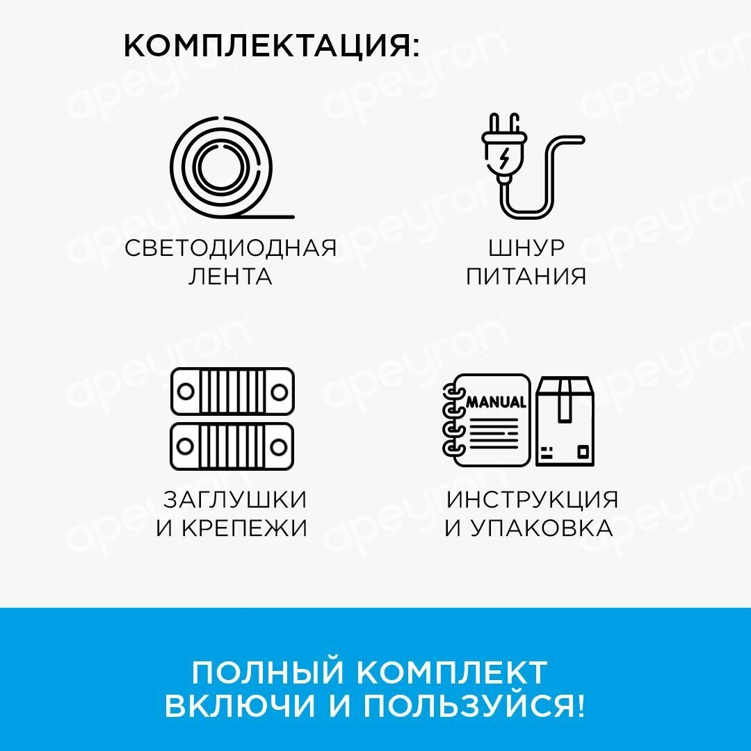 | Комплектация | Светодиодная лента 5 метров; шнур питания с коннектором для подключения к 220В; П-образные крепежи; Заглушки. |
