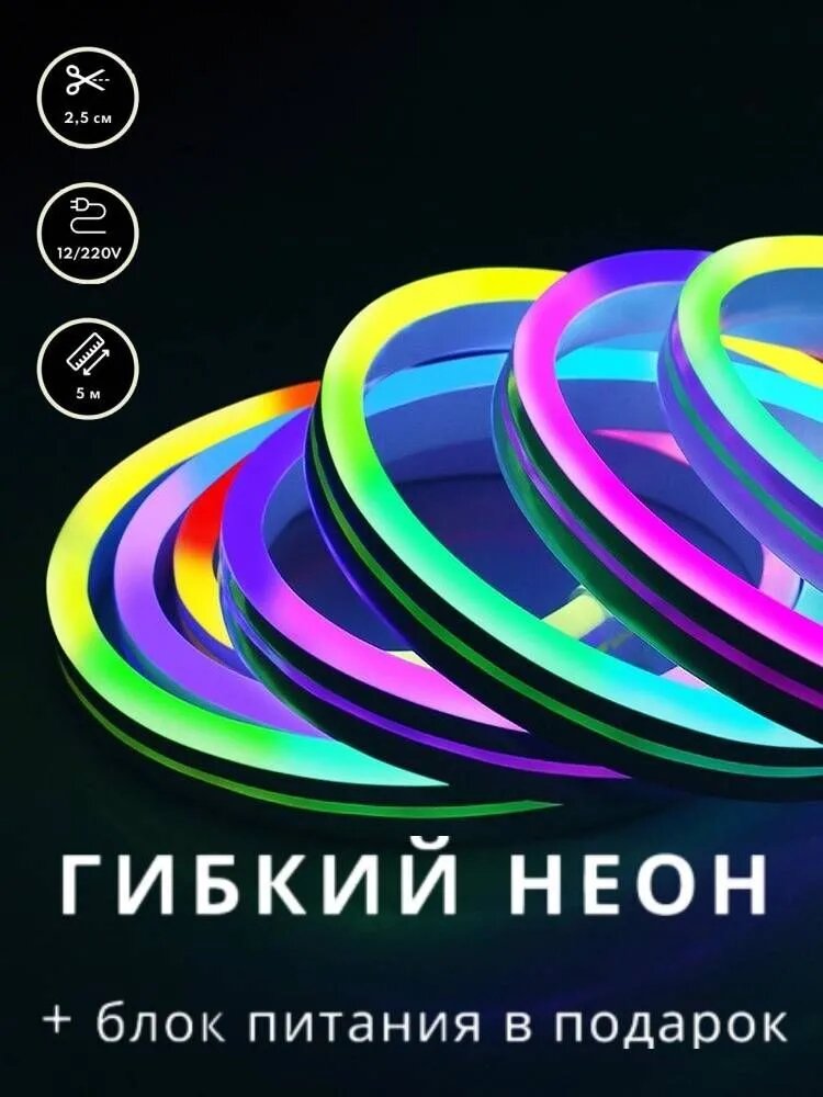 Неоновая светодиодная лента RGB, PJ Neon 5 метров с адаптером питания, 6х12, 12В, разноцветный информация: