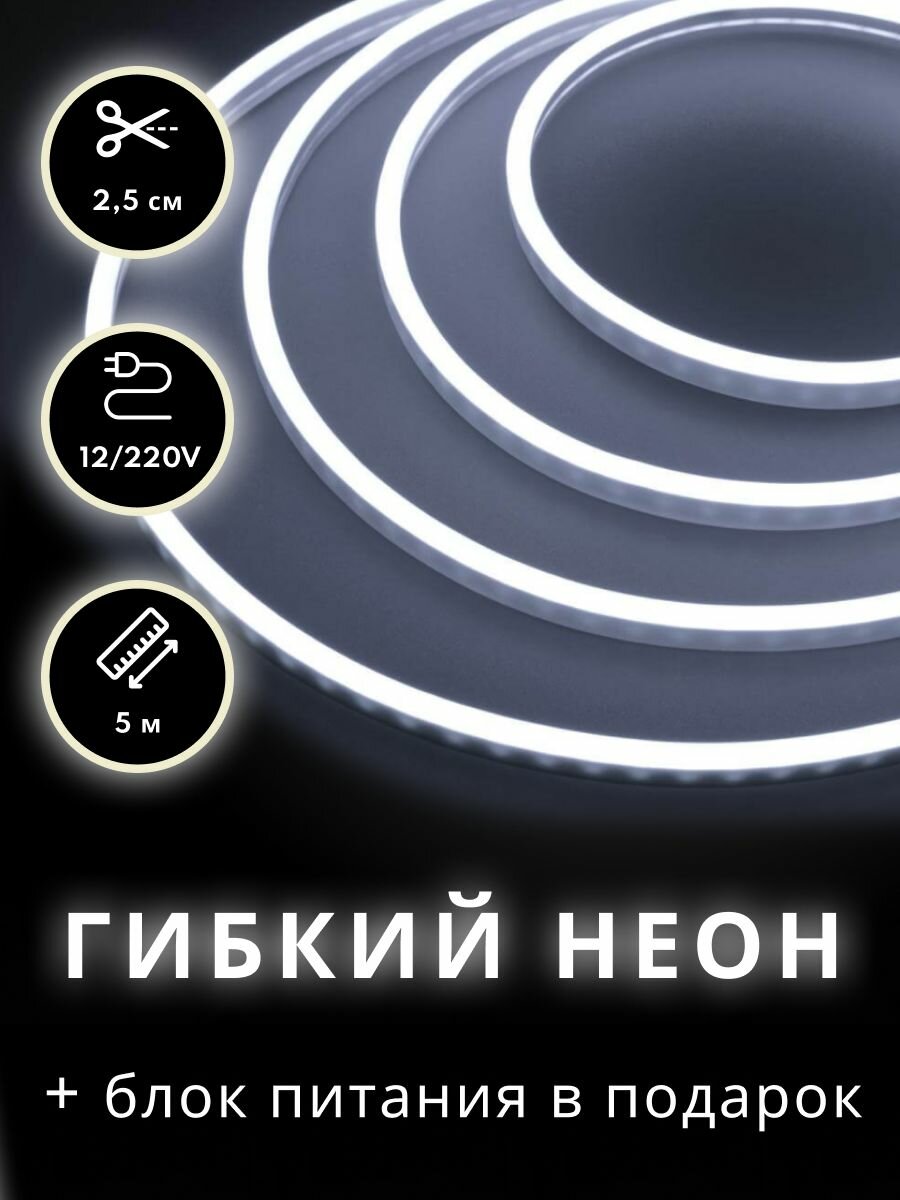 Неоновая светодиодная лента PJ Neon 5 метров с адаптером питания, 6х12, 12В, 9.6Вт, IP67, 120 LED/метр, холодный белый информация: