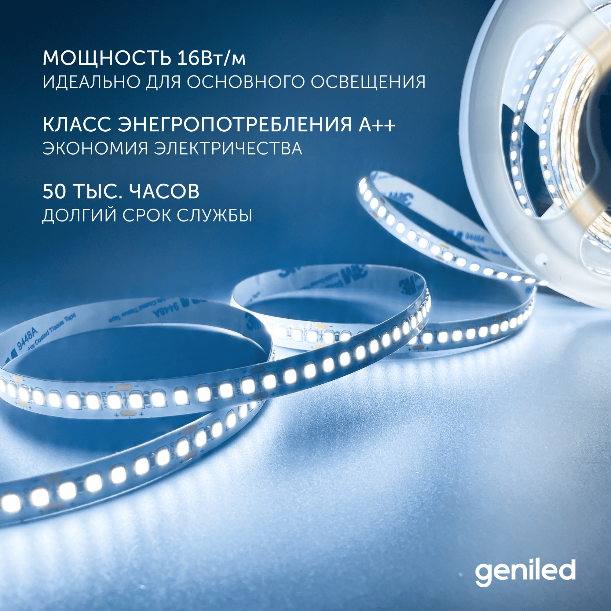 Светодиодная лента, подсветка Geniled - для комнаты, в гардероб, на кухню - Белый Нейтральный свет / GL-180SMD2835 / 1390 Лм/м / 24В / длина - 5м / B - 10 мм / W - 16 вт / 4000 К / IP33 4 413 ₽