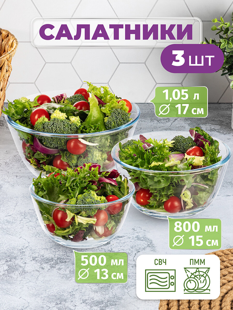 | Дополнительная информация | Набор 3 салатников "Crystal glass" - 13х13х7 см 500 мл, 15х15х8 см 800 мл, 17х17х9 см 1050 мл, стекло жаропрочное |