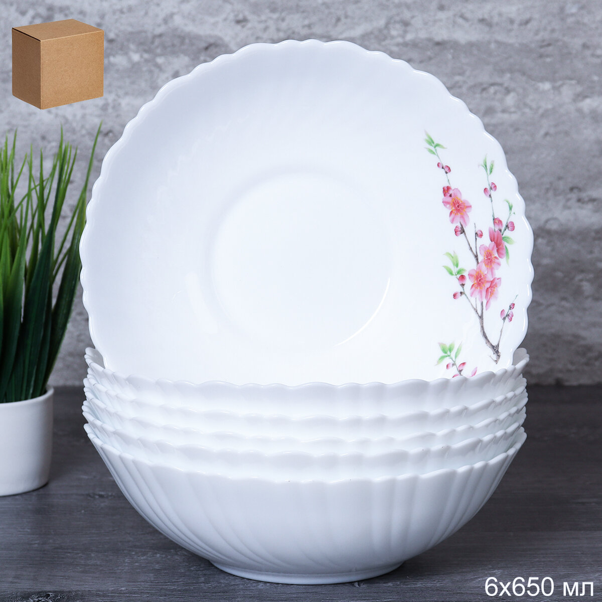 Салатник 480 мл 155 мм тарелка глубокая WHITE LILY "Кустовая роза" 6 штук