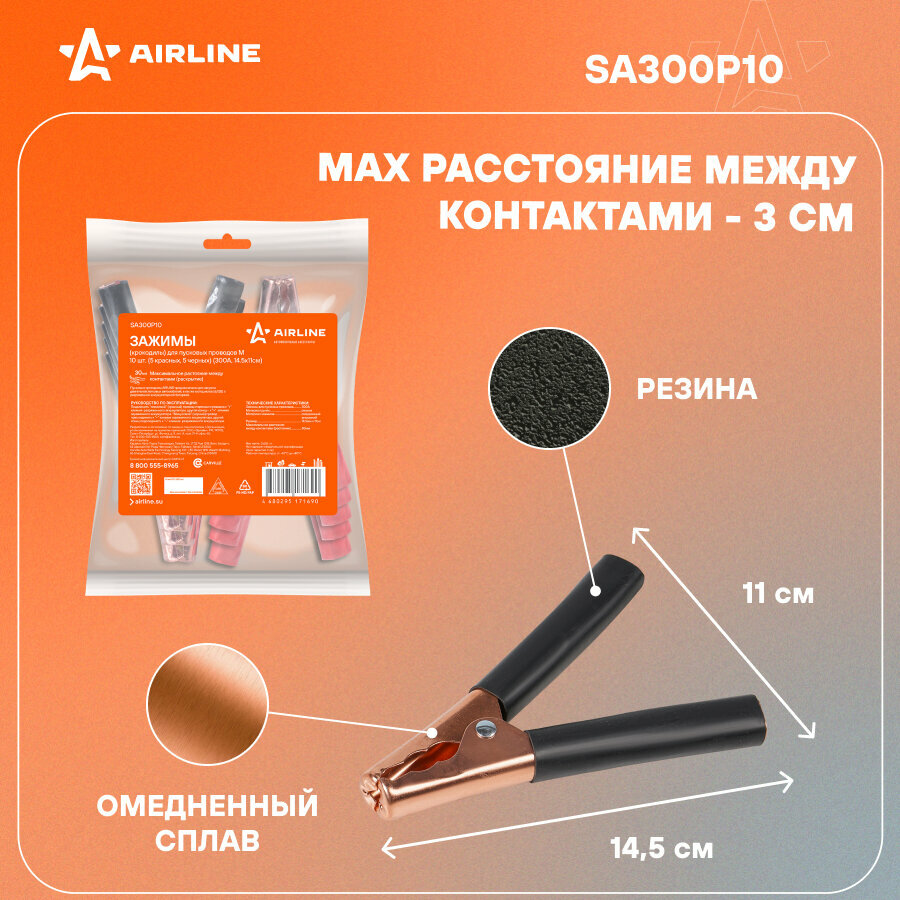 Зажимы (крокодилы) для пусковых проводов М (10 шт.) (300А, 14,5х11см) SA300P10 AIRLINE информация: