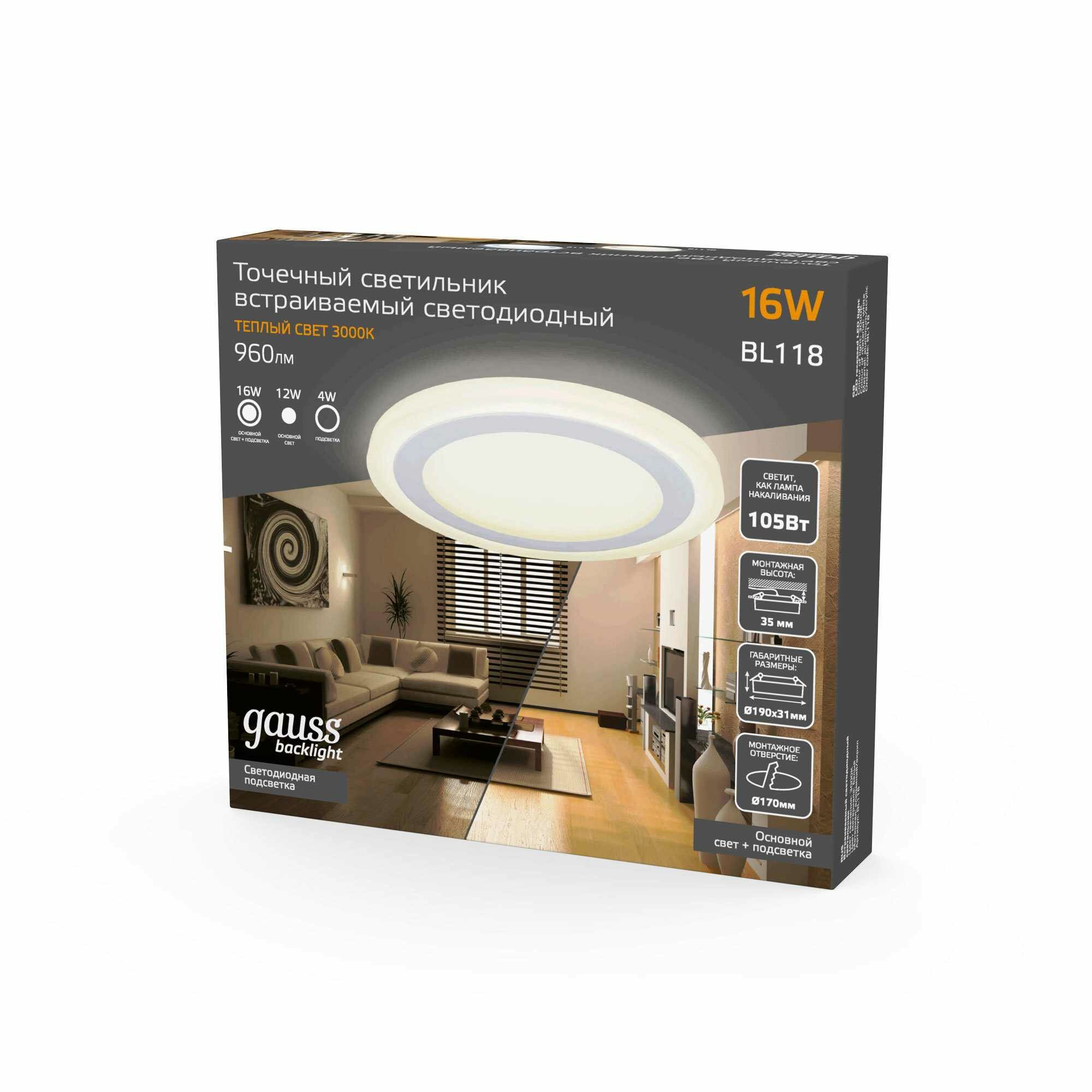 Отзывы на Светильник встраиваемый светодиодный Gauss Backlight BL118 круглый 12/4 Вт 3000 K, алюминий/акрил, цвет белый