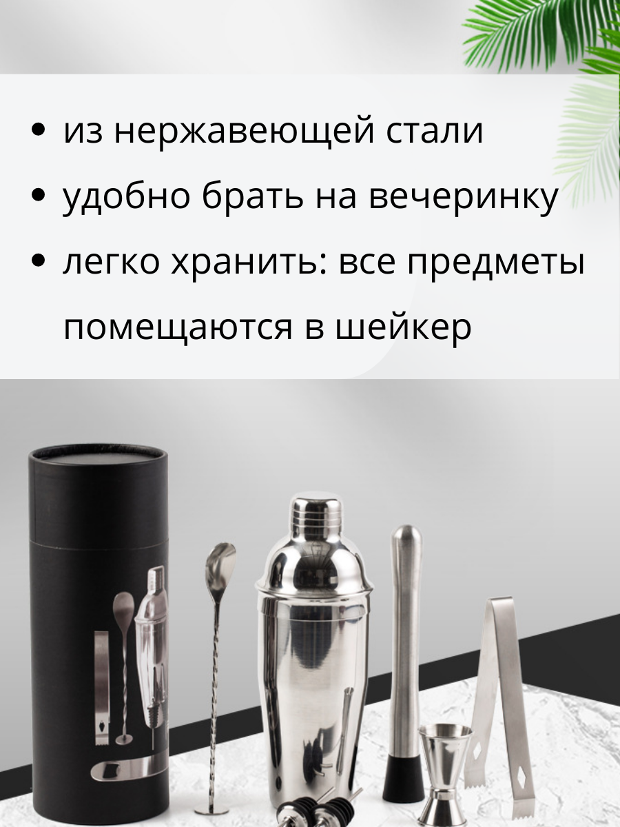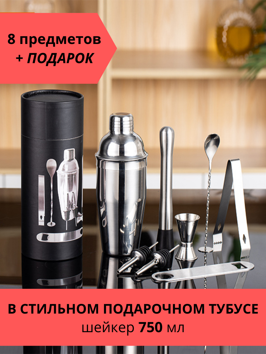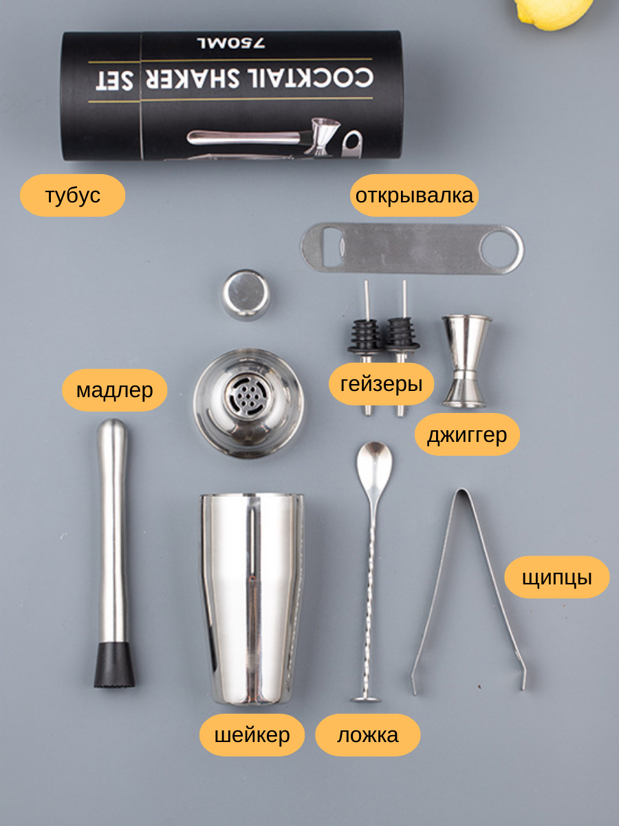 | Подробная комплектация | шейкер 750мл, мадлер, ложка с пяткой, открывалка, джиггер, щипцы, 2 гейзера |