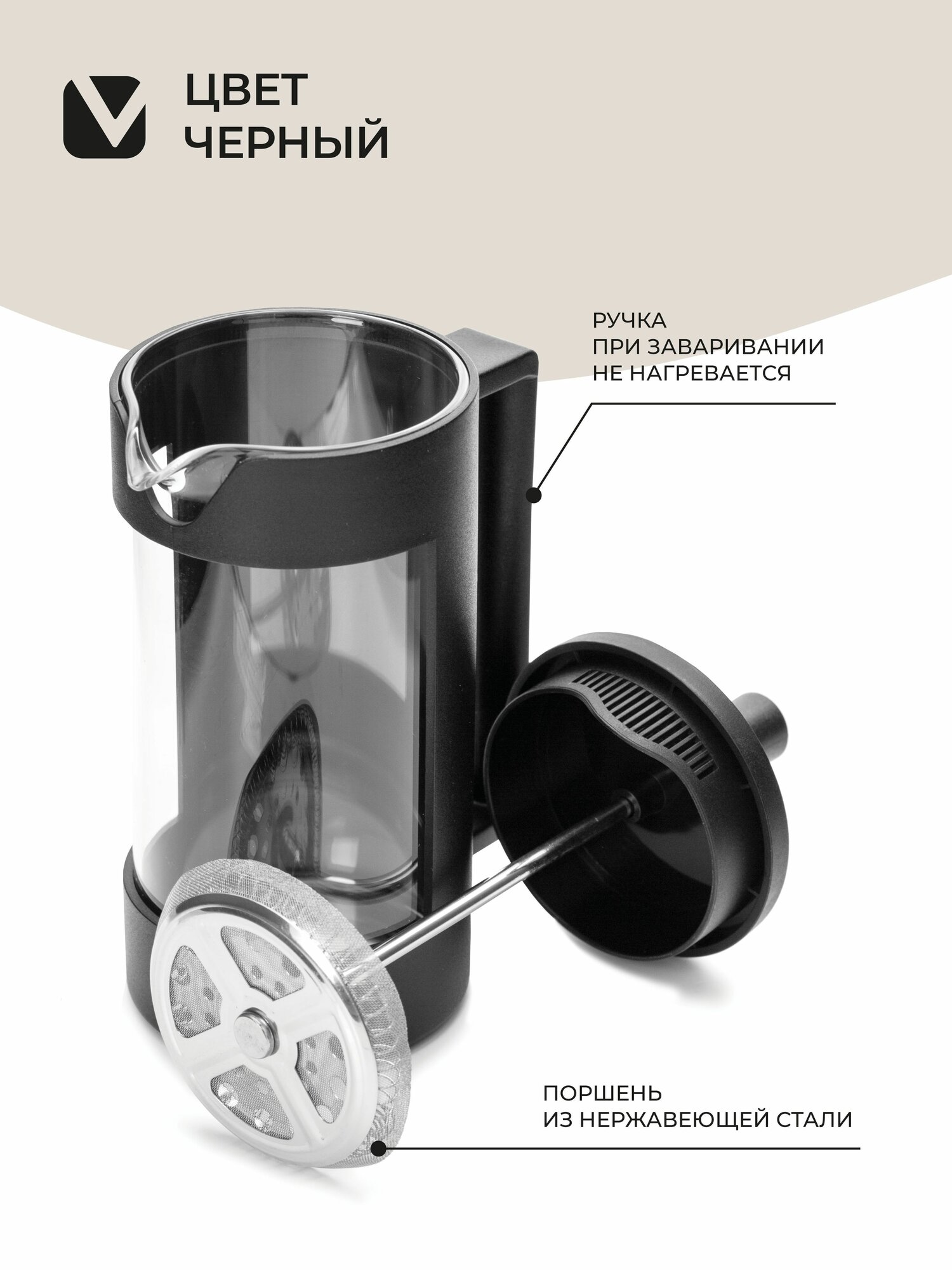 | Дополнительная информация | использование и уход за френч-прессом: перед первым использованием вымойте все части френч-пресса в тёплой воде с моющим средством; необходимо промывать френч-пресс после каждого использования, для очистки используйте щадящие чистящие средства; не рекомендуется использовать в микроволновой печи и на открытом огне; металлические части не рекомендуется мыть в посудомоечной машине |