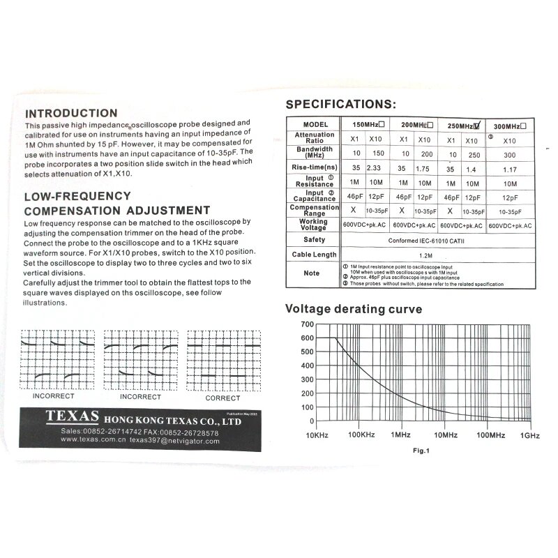 Комплект щупов осциллографа PK8200, 10x20 МГц, 250 МГц, 600 в, TEXAS250 250MHz информация: