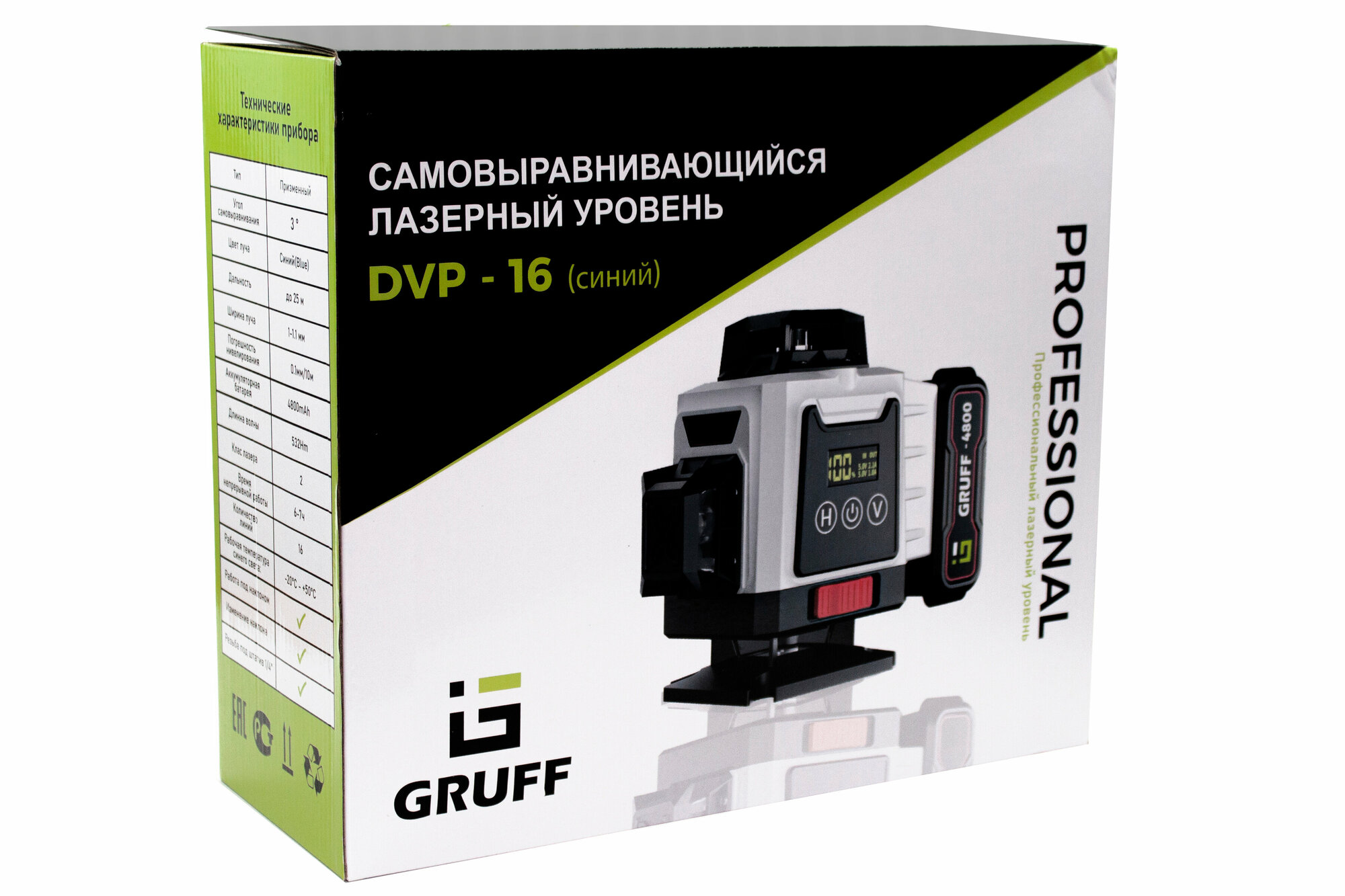 Лазерный уровень GRUFF DVP-16 4x360°, аккумулятор 4800 мАч с зеленым лучом и дисплеем информация: