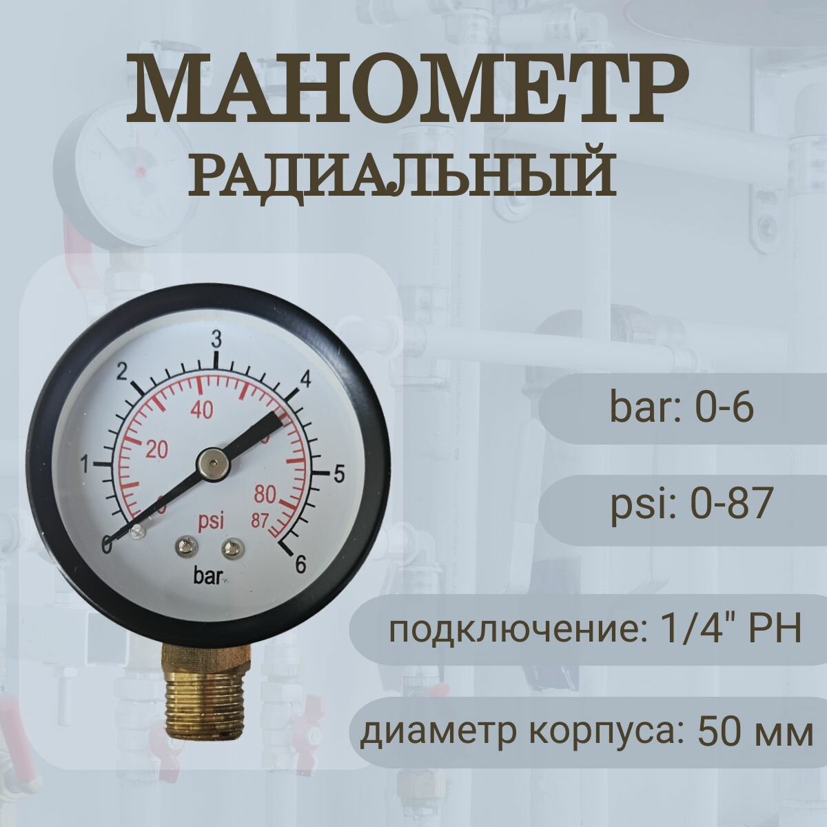 Манометр радиальный 50 мм, 0-6 бар, резьба 1/4" информация: