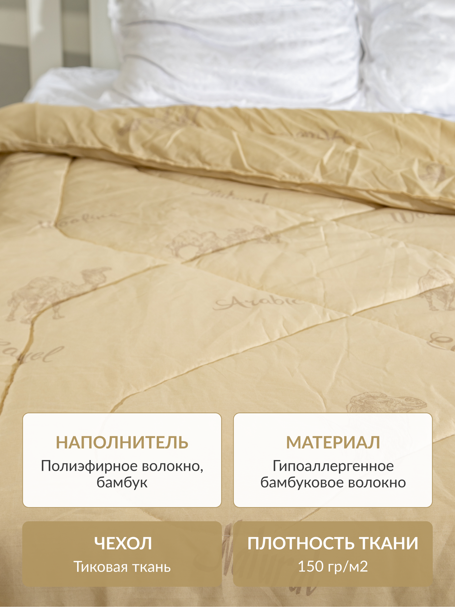 Одеяло 1,5 спальное (145x205), чехол: 100% п/э, наполнитель: полиэфирное волокно, верблюжья шерсть, цвет светло-коричневый информация: