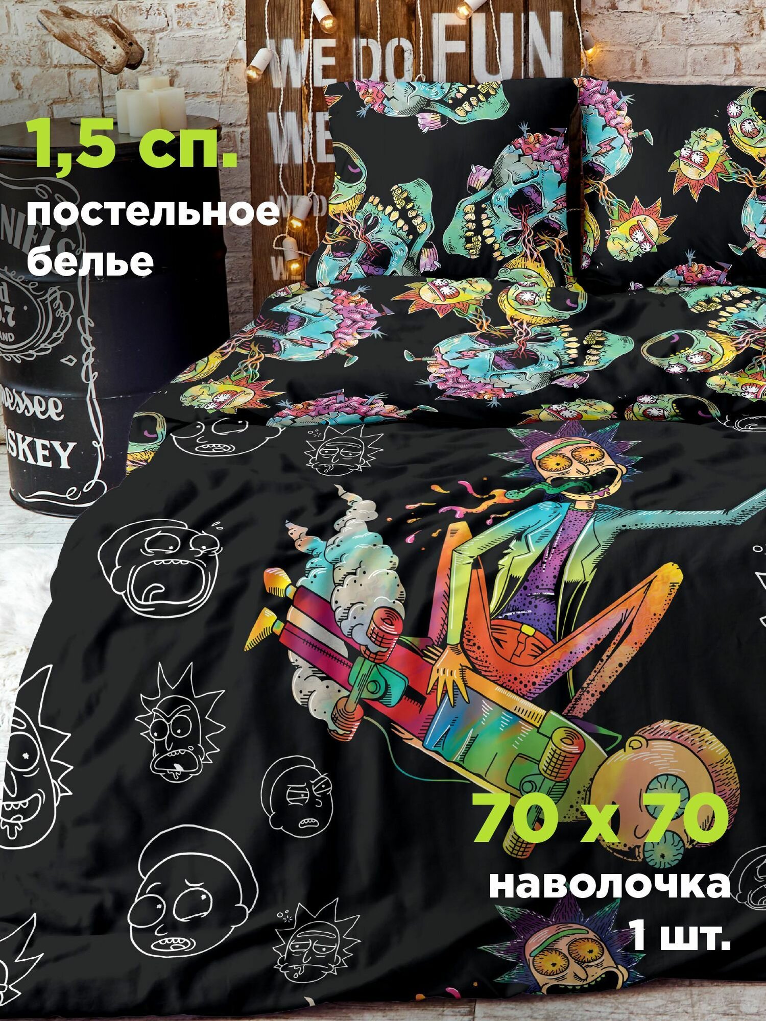 Комплект постельного белья 1,5 спальный Crazy Getup, поплин хлопок, 1 наволочка 70х70, постельное белье 1 5 спальное Рик и Морти неон / Психоделика, светится В темноте, 16456-1/16457-1, постельное белье детское информация: