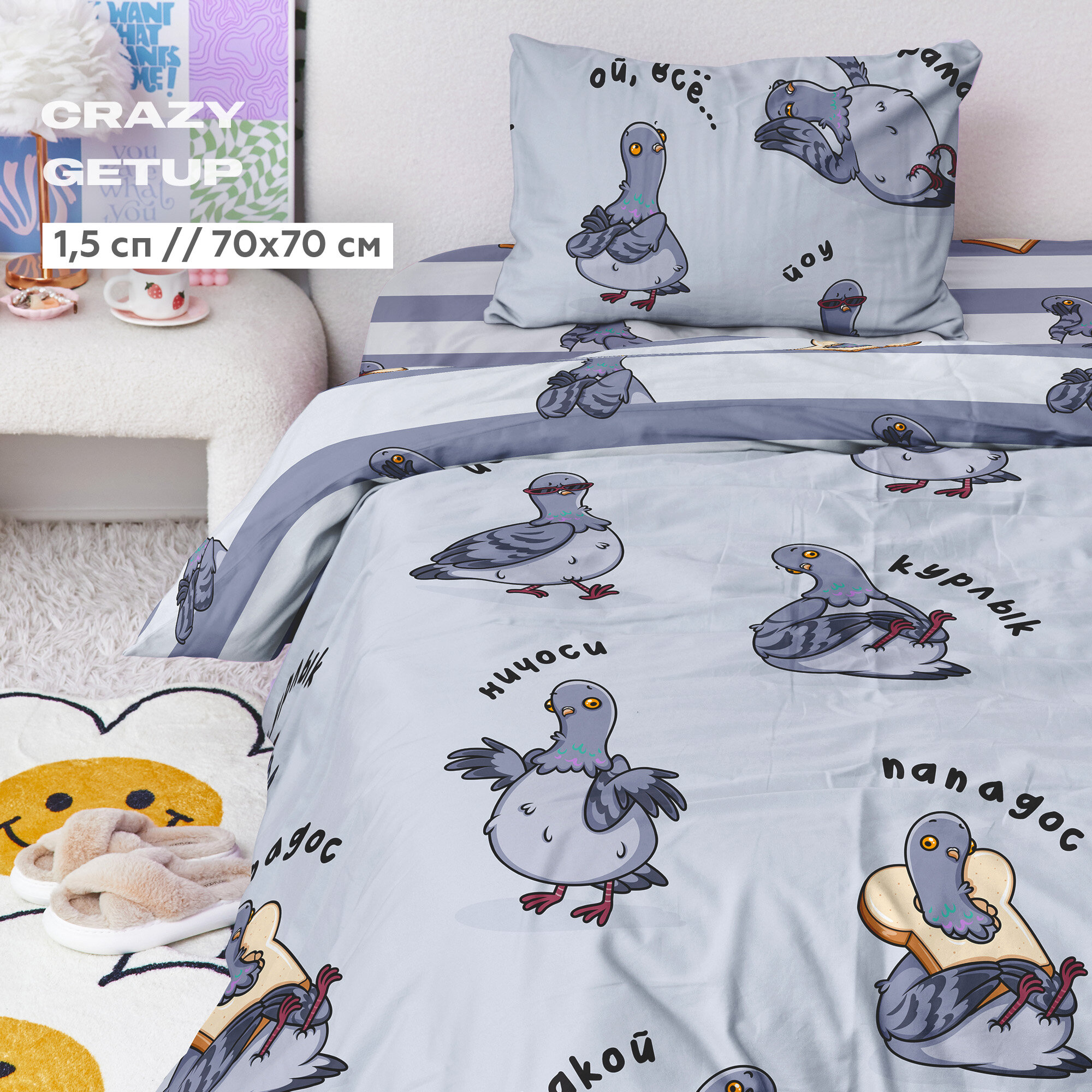 Постельное белье 1.5 спальное Crazy Getup, Поплин, нав. 70х70, La Kurlyk (Голубь мем) информация: