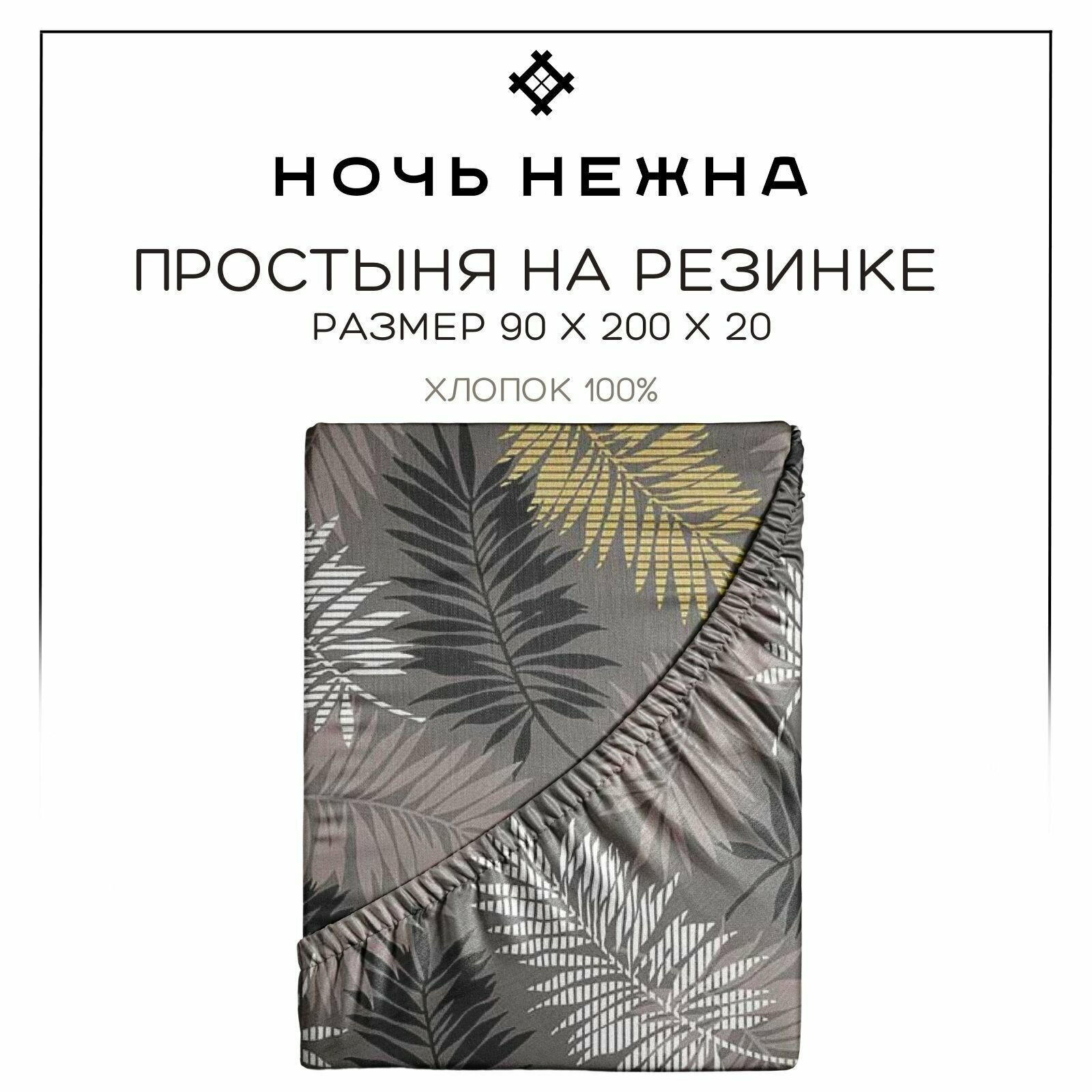 Простынь на резинке/180х200/бязь/натяжная/наматрасник/простыня/хлопок/Ночь Нежна/Тропики серый