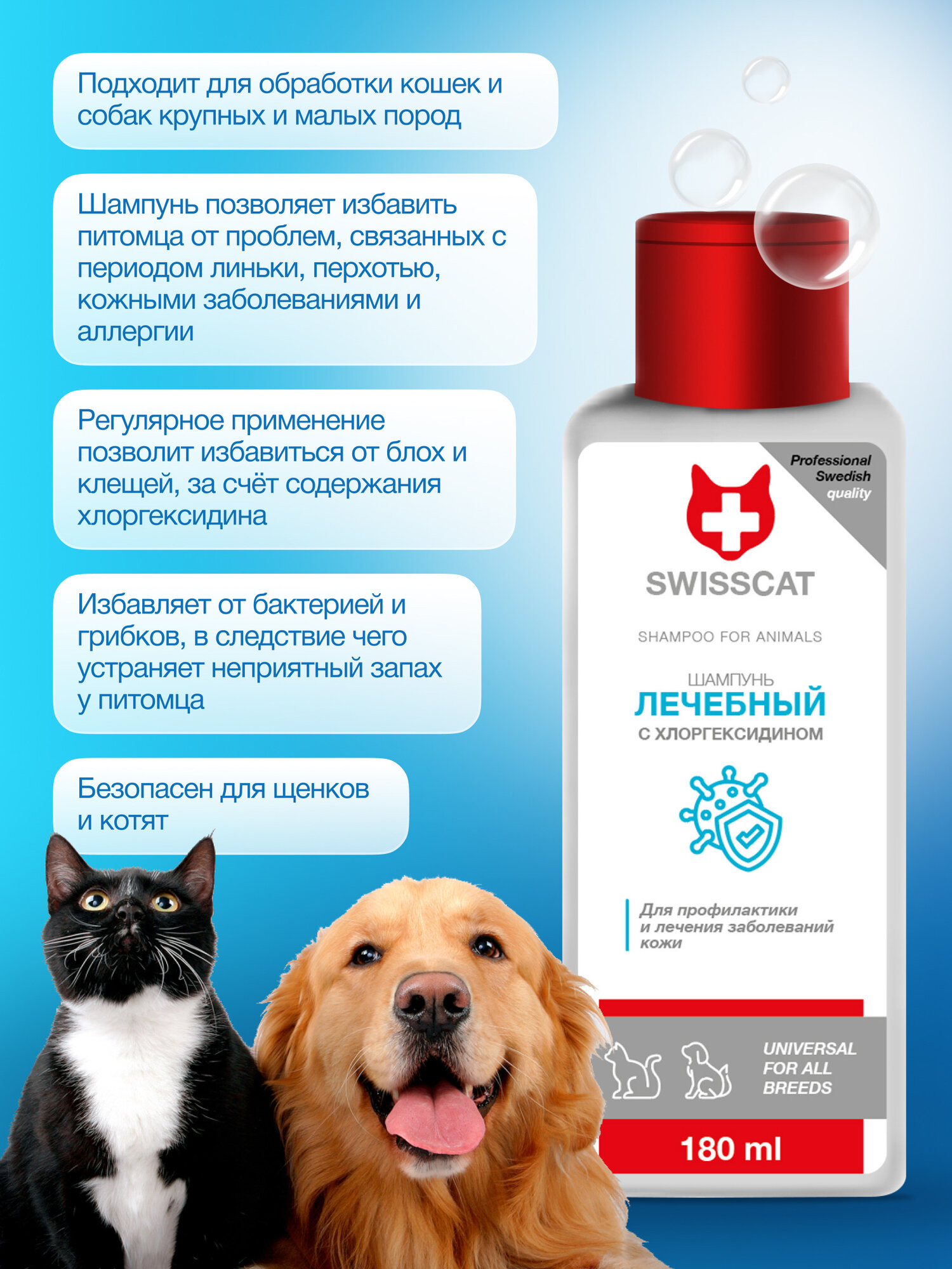 Шампунь для собак и кошек SWISSCAT лечебный с хлоргексидином, антибактериальный, против зуда и запаха, 180 мл информация: