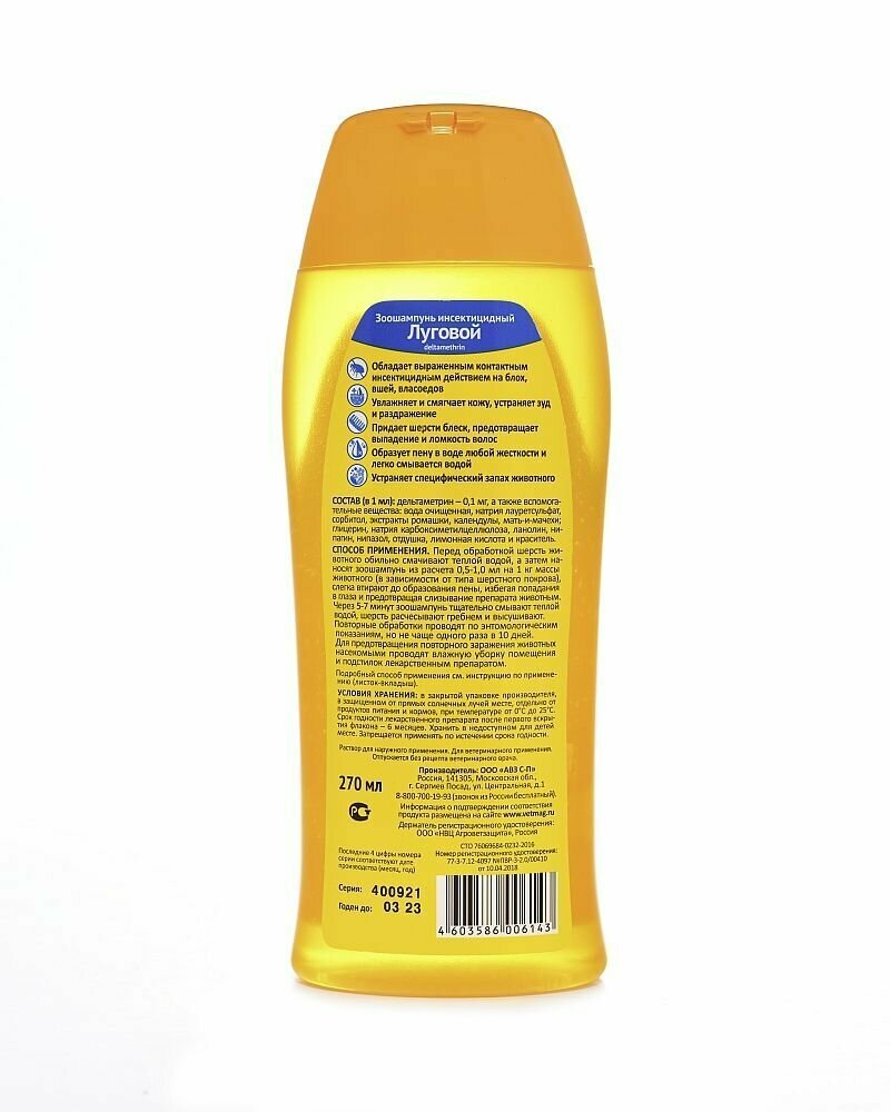 | Подробная комплектация | Луговой инсектицидный зоошампунь для собак и кошек - 270 мл |