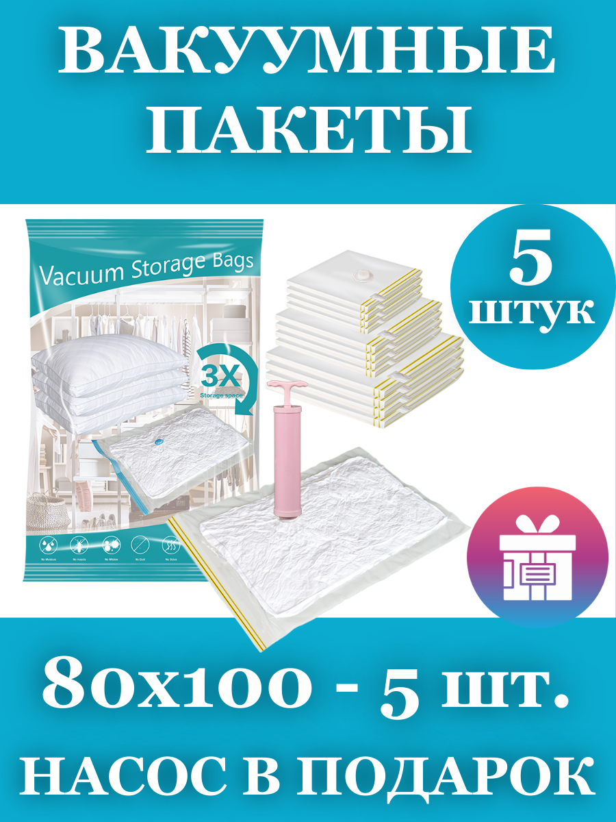 Вакуумные пакеты для вещей и одежды 80х100, 5 штук информация: