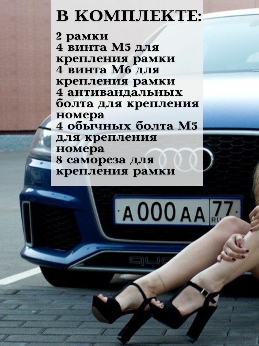 | Комплектация | рамки для номеров 2 шт;винты М5 и М6 для крепления рамки 8 шт;антивандальные болты для крепления номера 4 шт;обычные болты М5 для крепления номера 4 шт;саморезы для крепления рамки 8 шт |