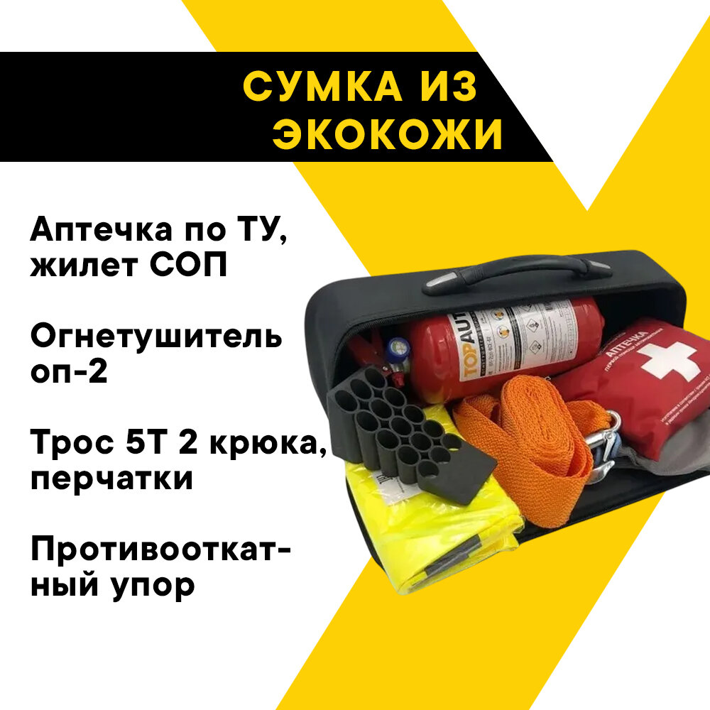 Набор автомобилиста с огнетушителем Топ Авто (сумка из эко-кожи, огнетушитель, аптечка, жилет, трос 5т 2 крюка, упор, перчатки) информация: