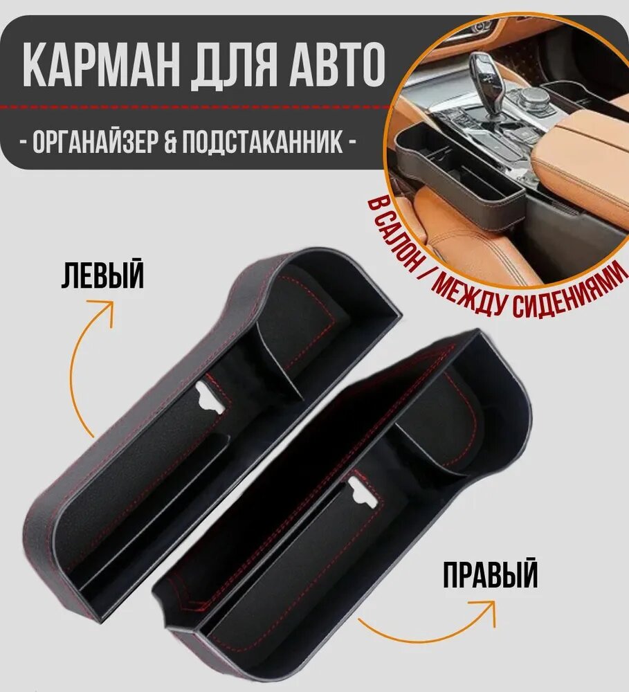 Дорожный карман между сиденьями автомобиля с подстаканником / черный цвет красная строчка / комплект 2 шт. информация: