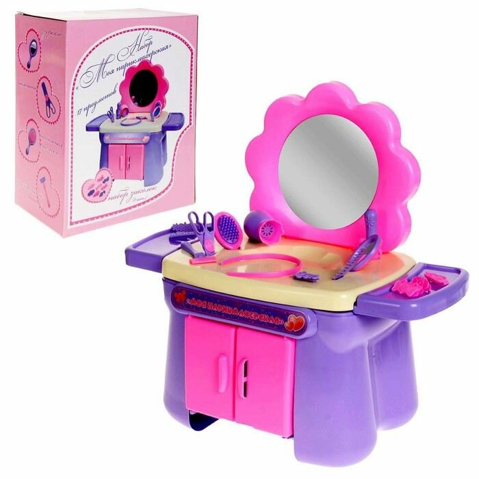 | Комплектация | стол,расческа,ножницы,плойка,бритвенный станок,фен,ободок,заколка 8шт,массажная расческа,зеркало. |