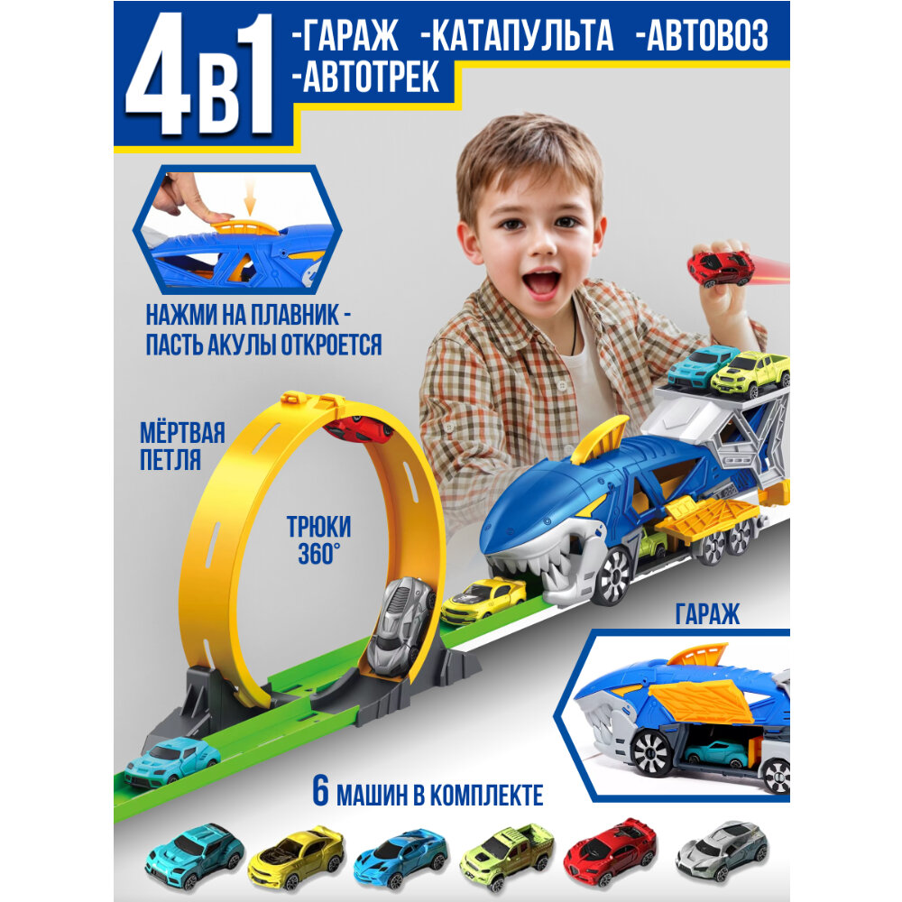 Детский гоночный автотрек с 6 машинками и автовозом Акула, 2 скорости запуска машинок информация: