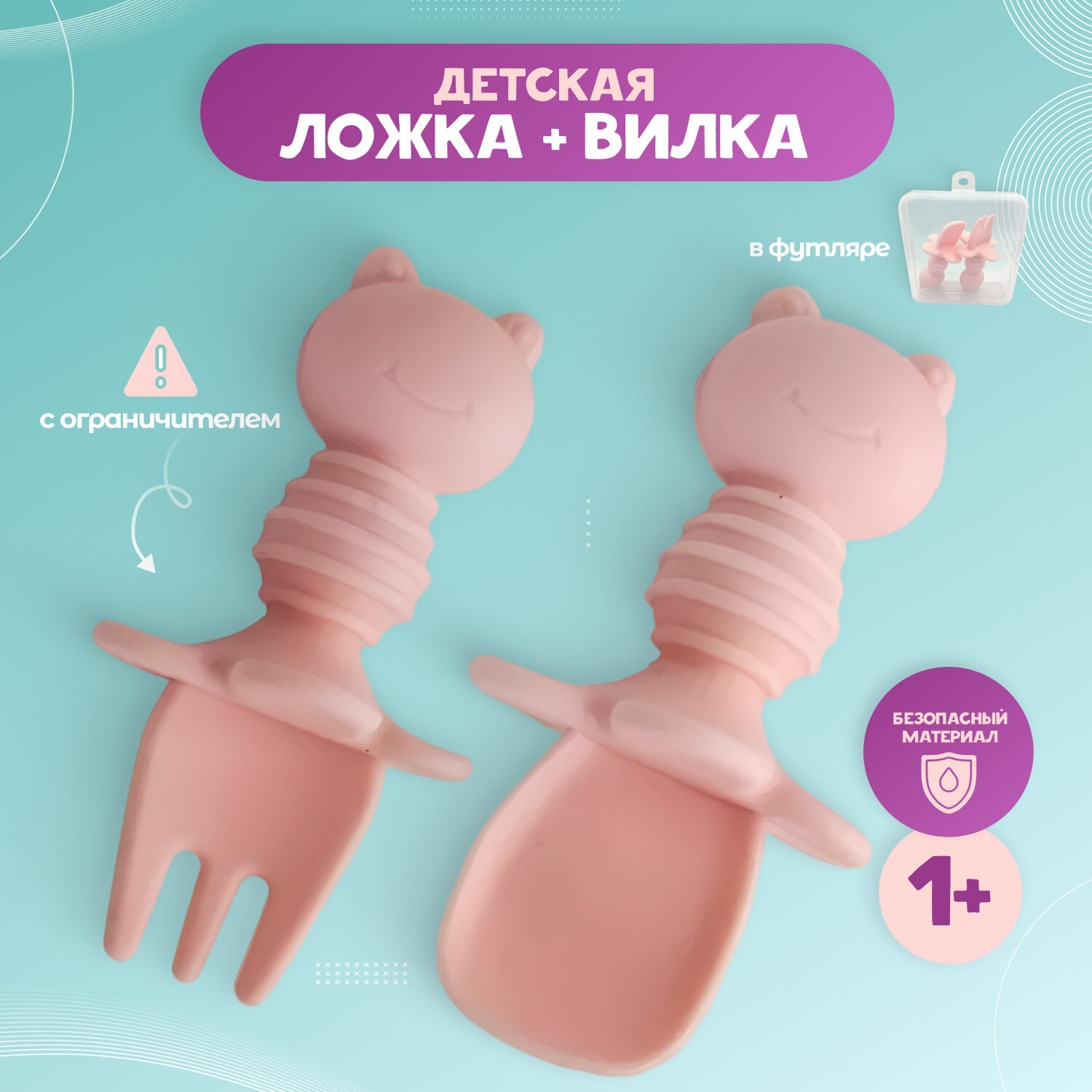 Ложка + вилка обучающая силиконовая для прикорма с ограничителем в футляре (розовый) информация: