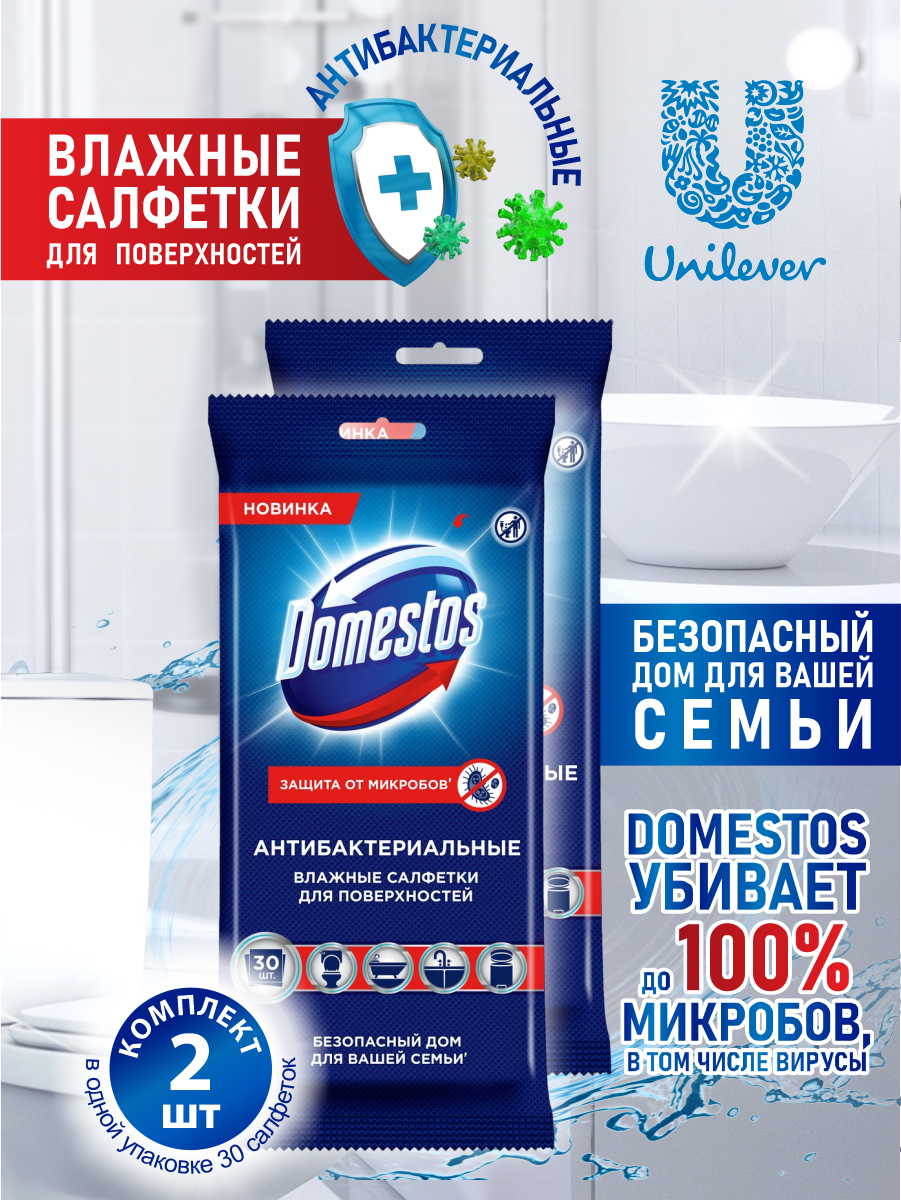 10 цен на DOMESTOS Влажные салфетки д/очищ. поверхностей антибактер, 30шт (2 уп в наборе)