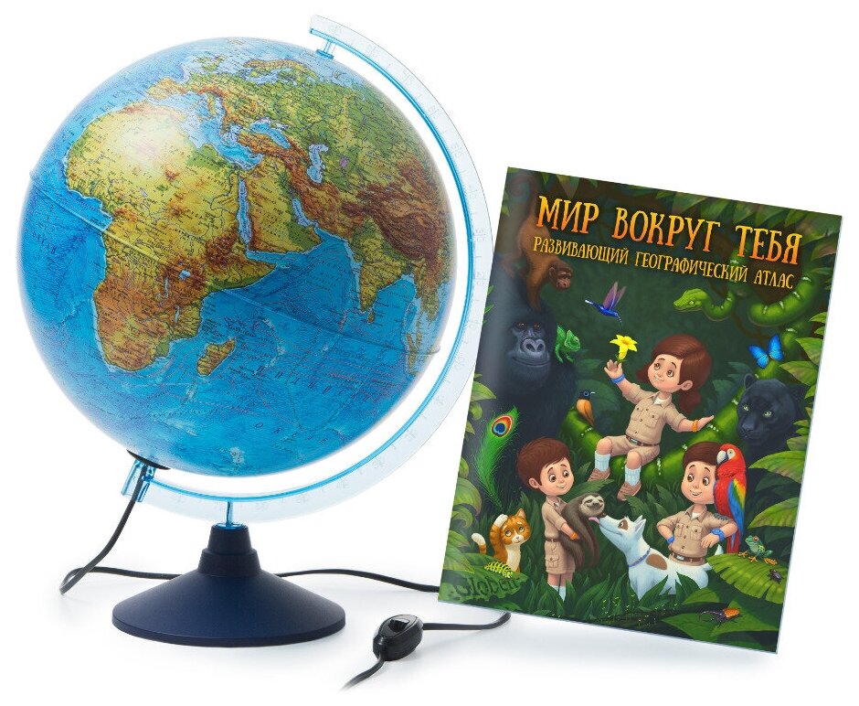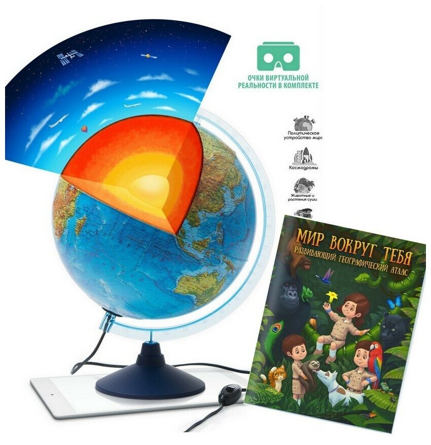 Интерактивный глобус Земли физико-политический Globen 32 см., с LED-подсветкой + Развивающий атлас "Мир вокруг тебя" + VR очки информация: