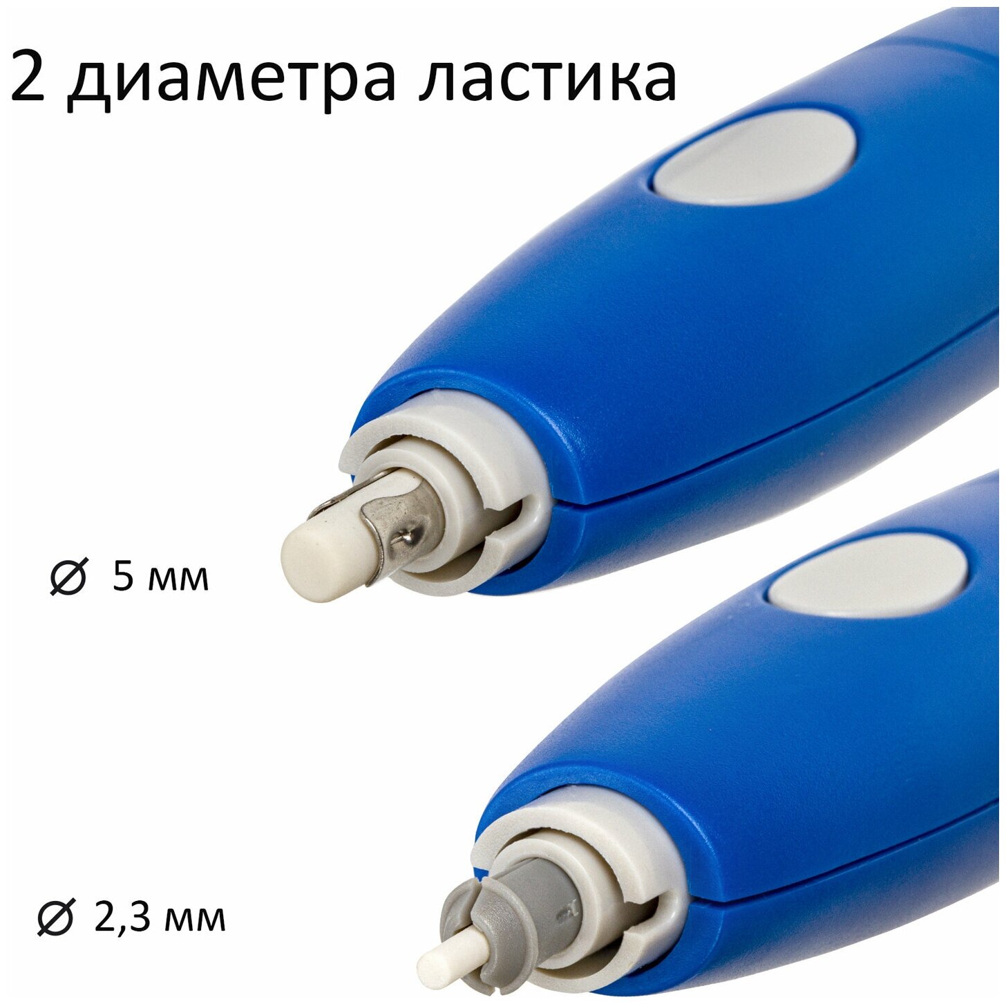 | Дополнительная информация | не оставляет бумажной пыли; 8 ластиков-насадок размером 5х25 мм, 8 ластиков-насадок размером 2,3х25 мм и два пластиковых держателя для них; работает от 2 батареек ААА (в комплект не входят); корпус пластиковый |